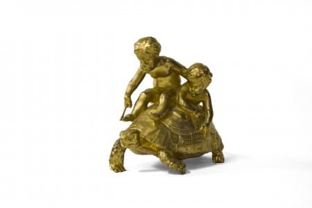 Deux enfants jouant avec une tortue, bronze doré, fondeur Barbed...