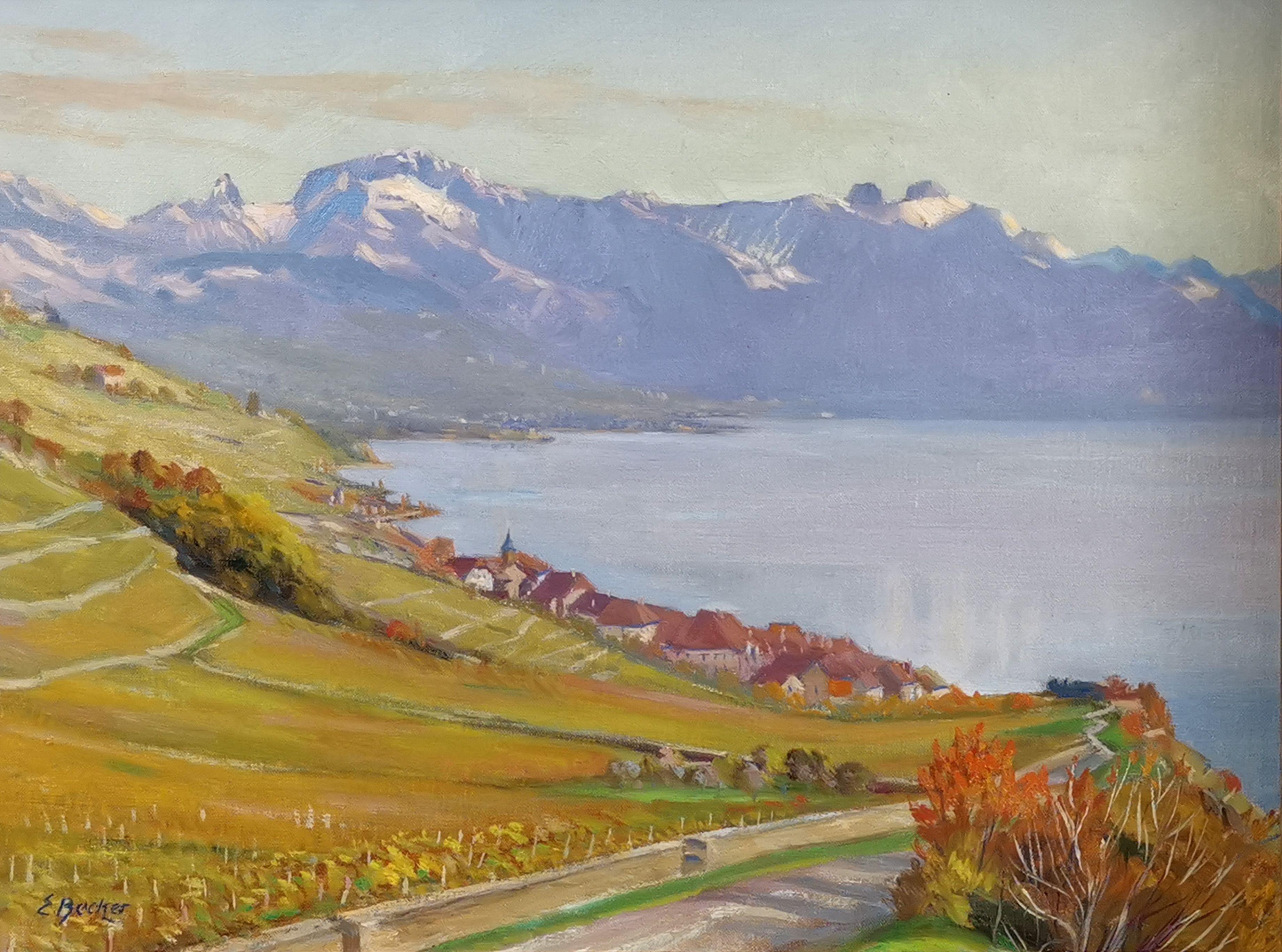 Rivaz et le lac Léman, huile sur panneau, signée, 31x40,5 cm