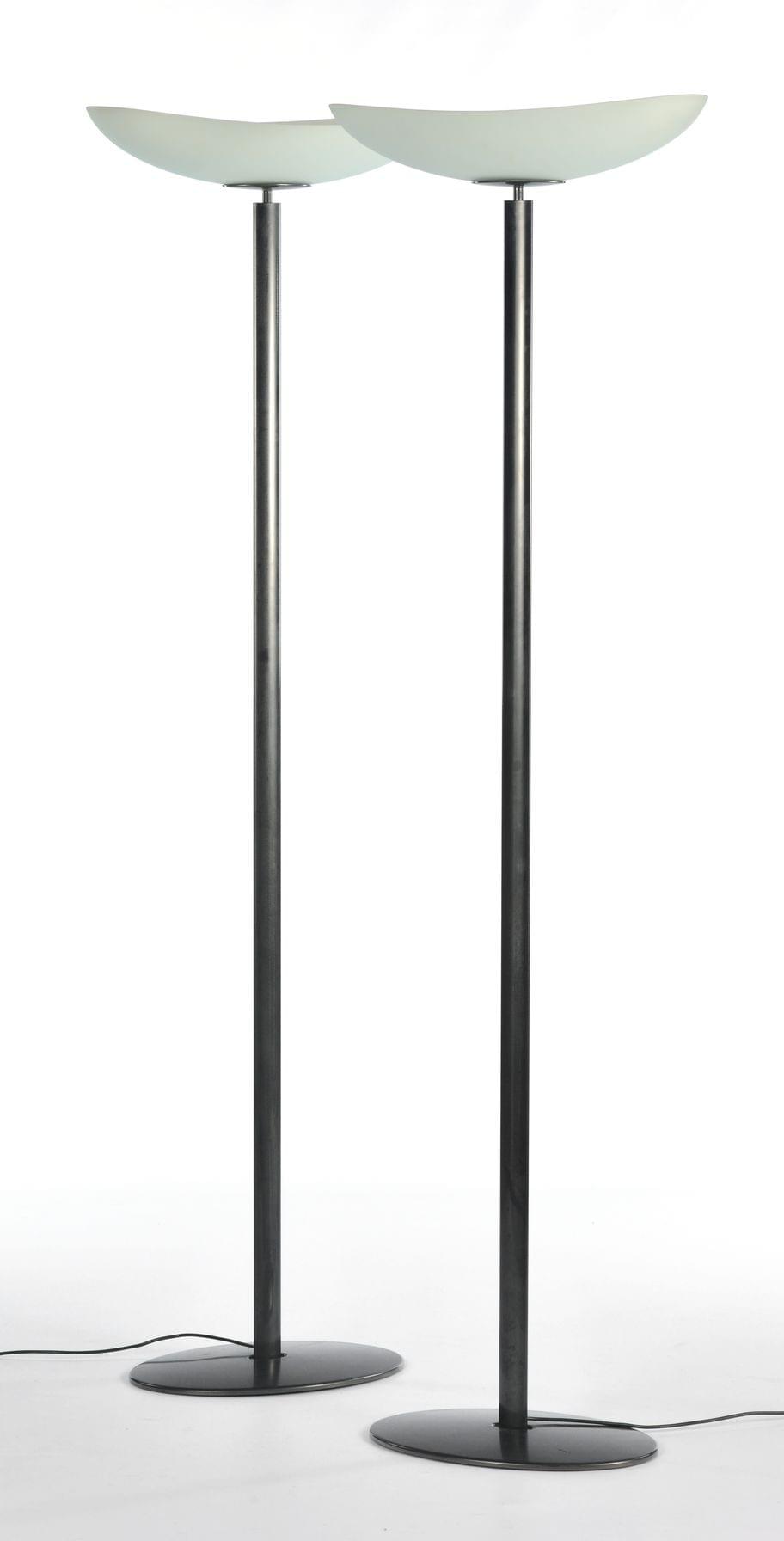 Paire de lampes de parquet Creonte, métal laqué gris, verre dépoli blanc, H 191 cm