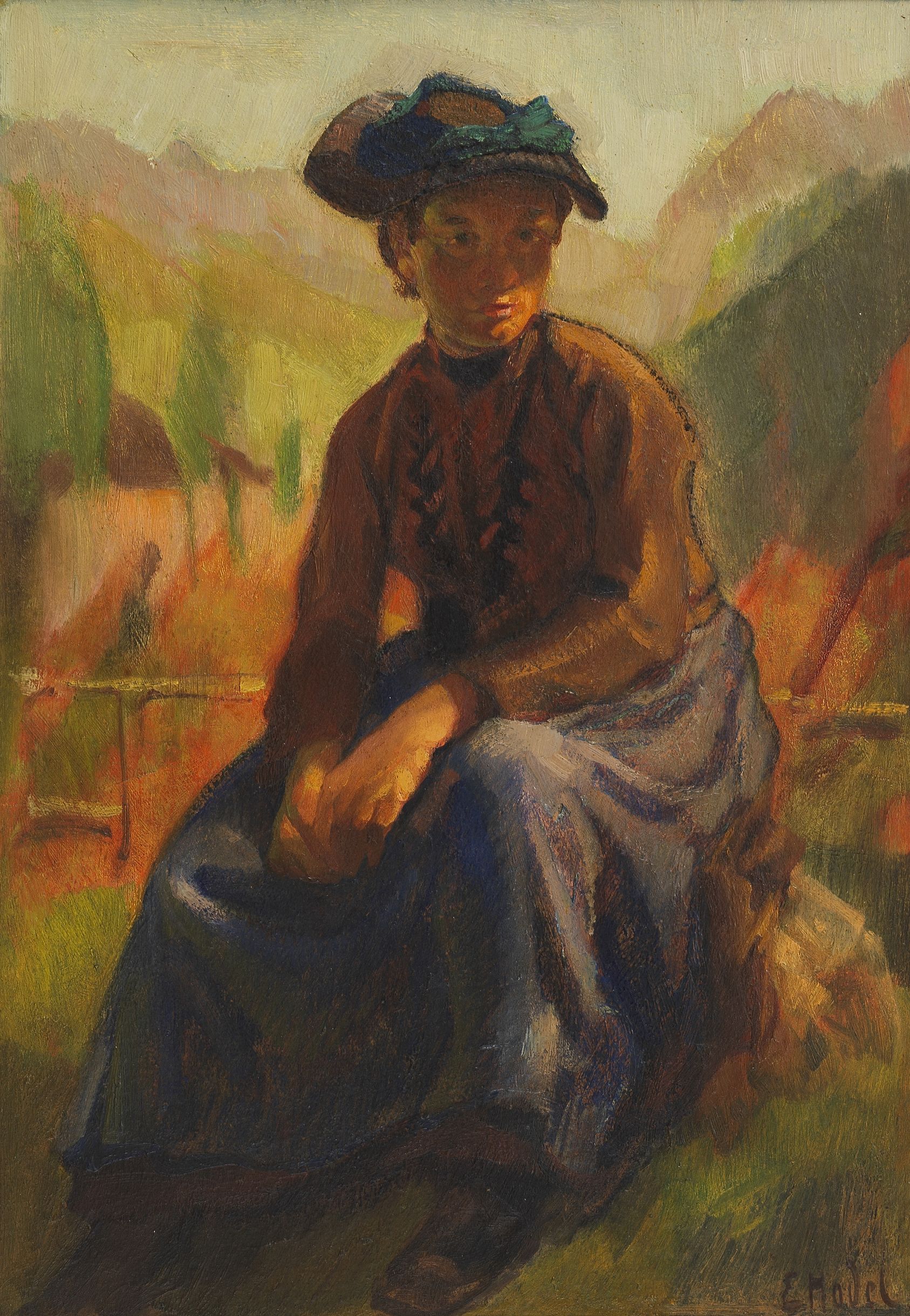 Jeune valaisanne, huile sur carton, signée, 64x38 cm