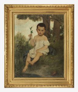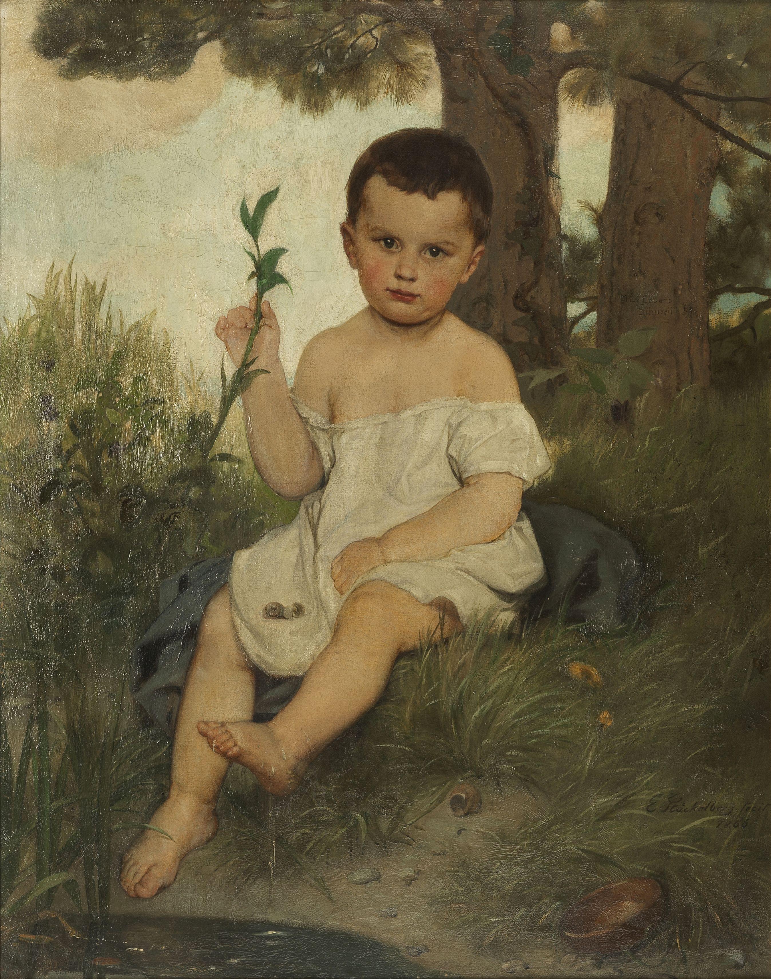 Portrait de Max Edouard Schneeli enfant sous les pins au bord de l'eau, huile sur toile, signée et datée 1866, 100x78 cm