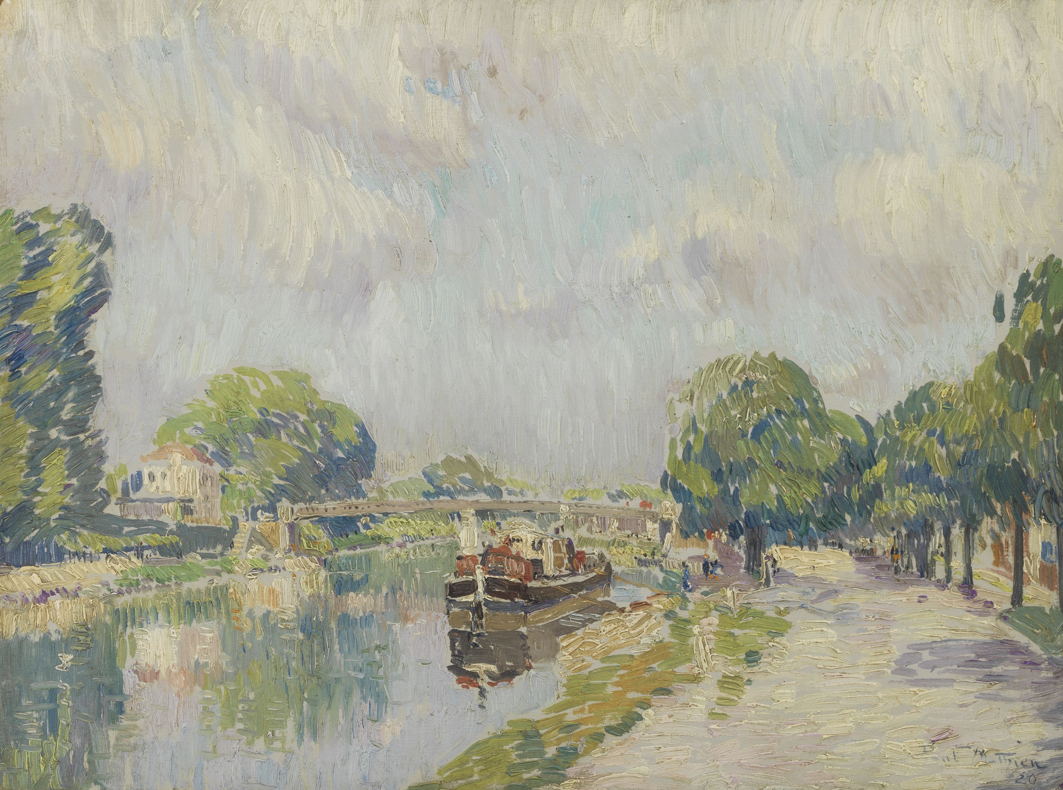Péniche sur le canal, huile sur carton, signée et datée 20, 40x5...