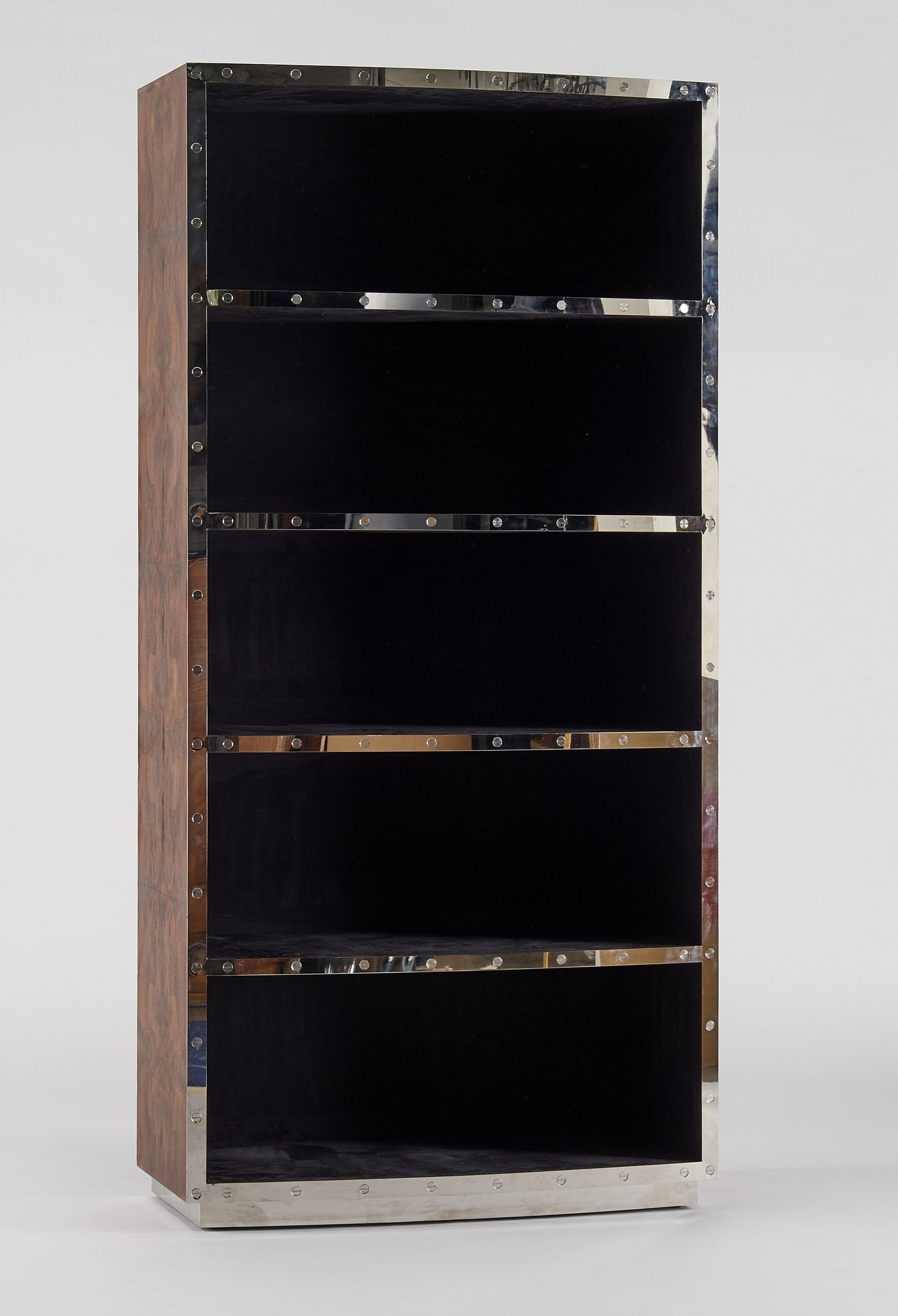 Acier chromé, placage de bois de loupe et daim bleu, 210x100x48 cm
