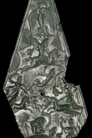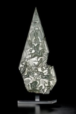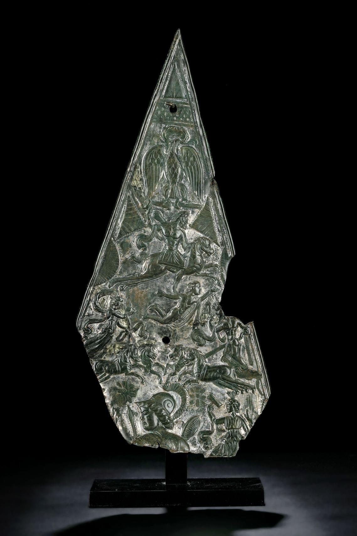 Bronze argenté repoussé à décor d'une scène de bataille et de divinités, Etendard, bronze et étain, H 30x13 cm. Provenance: Collection privée suisse