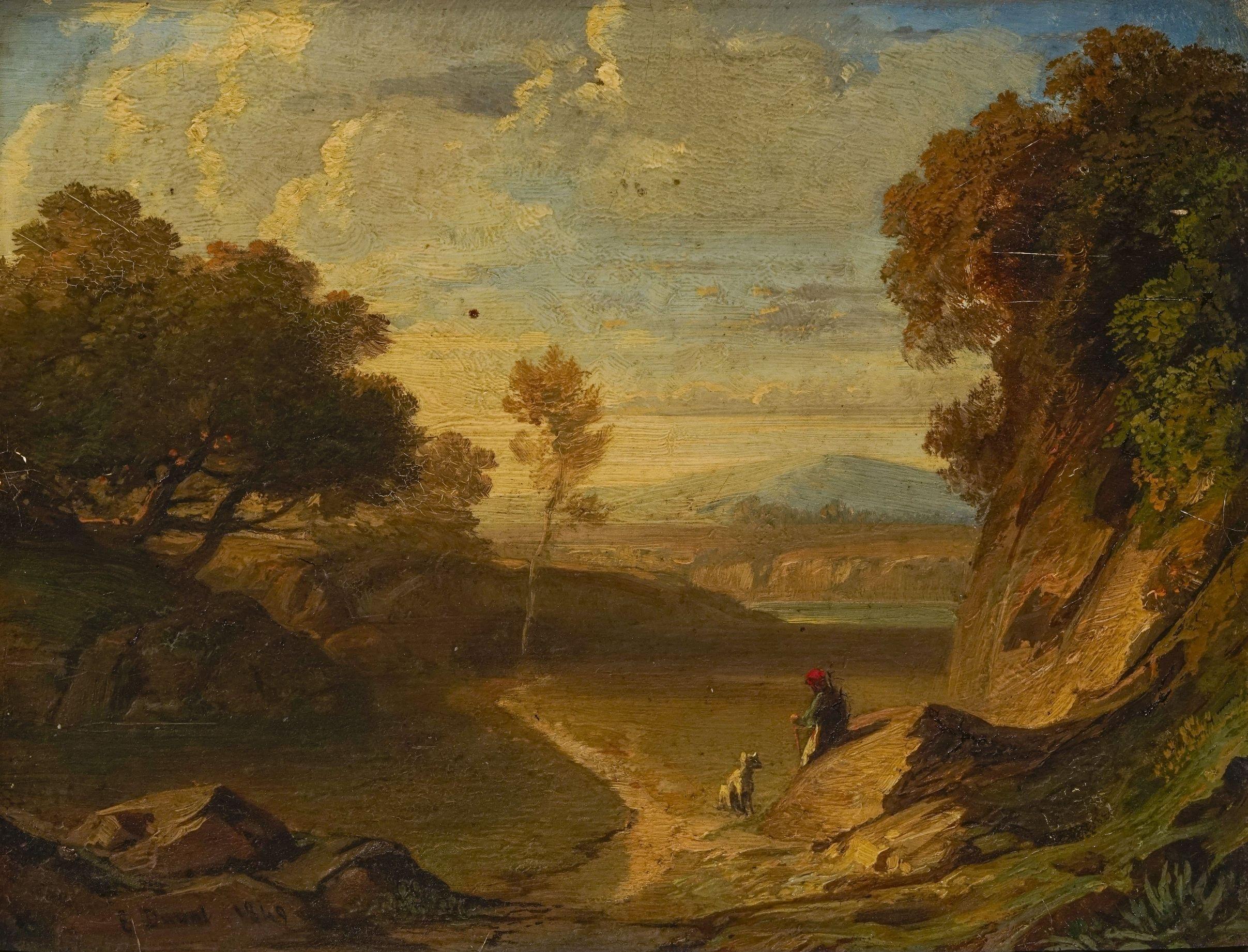 Paysage animé d'un personnage et son chien, huile sur panneau, signée et datée 1849, 18x23 cm