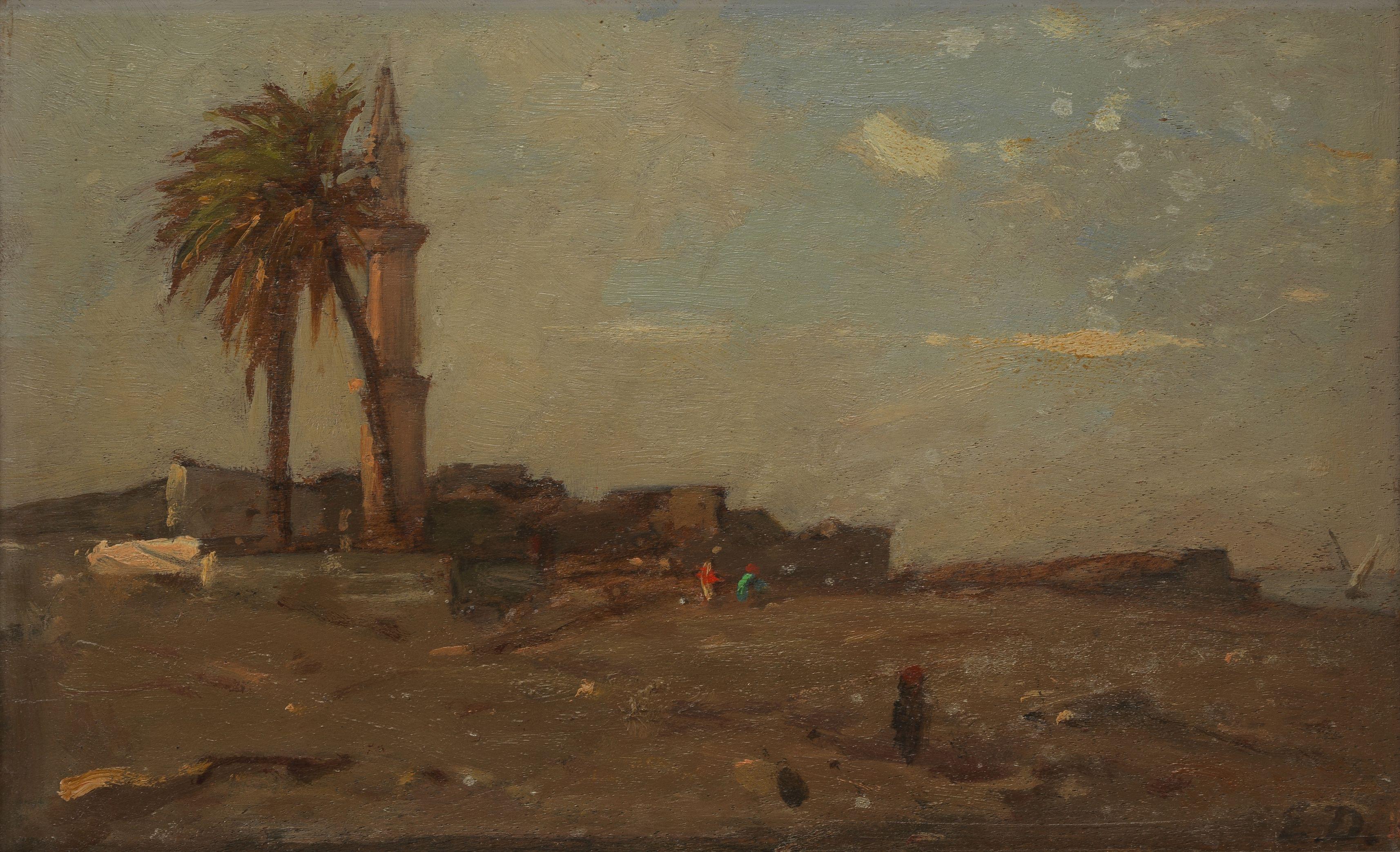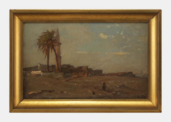 Etude de minaret, huile sur panneau, monogrammée, 12,5x21 cm