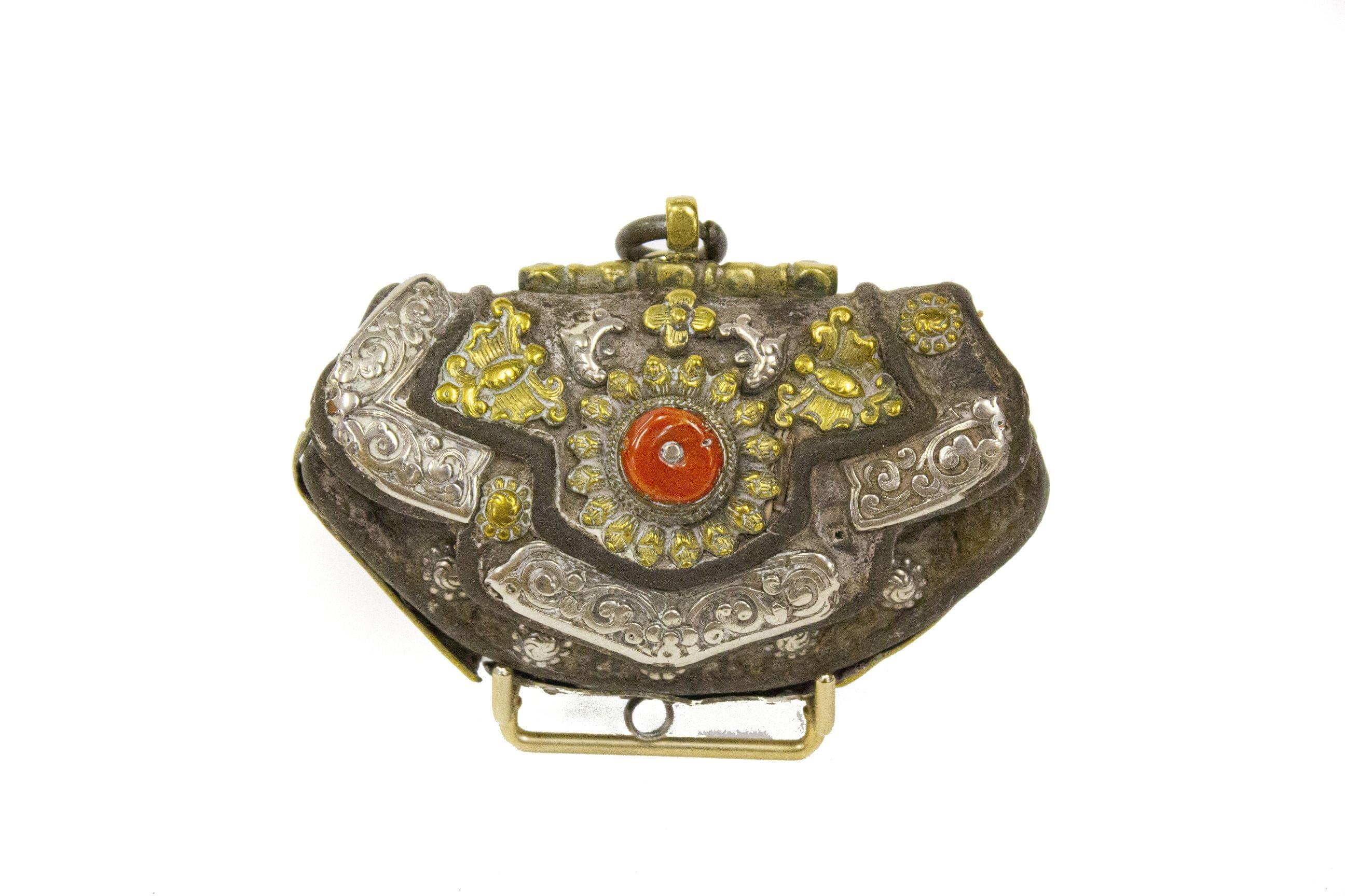 Cuir bordeaux, garniture en métal doré, dans sa boîte, H 9 cm. O...