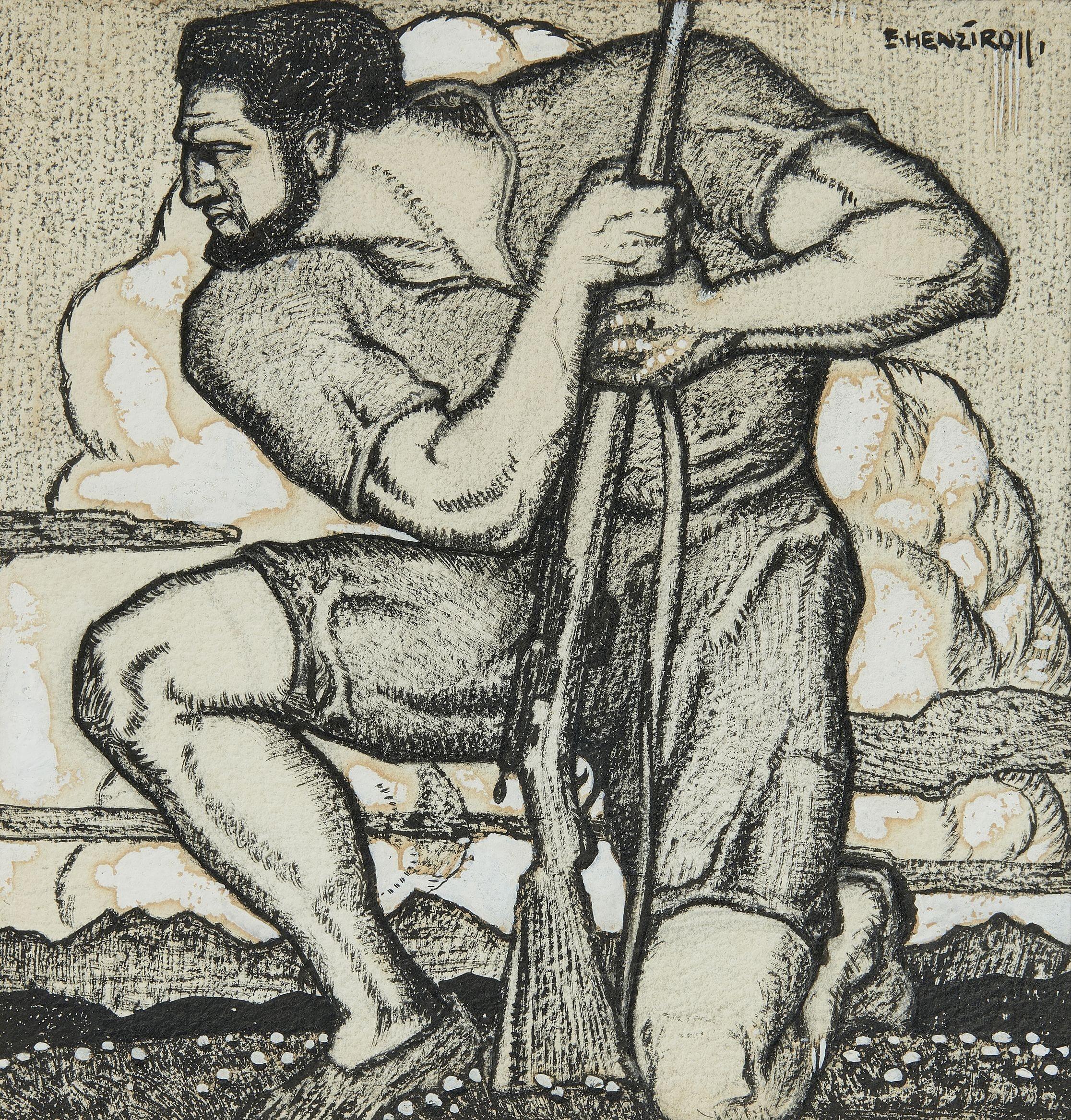 Tireur accroupi, encre, crayon, gouache sur papier, signée, 26,5x26 cm