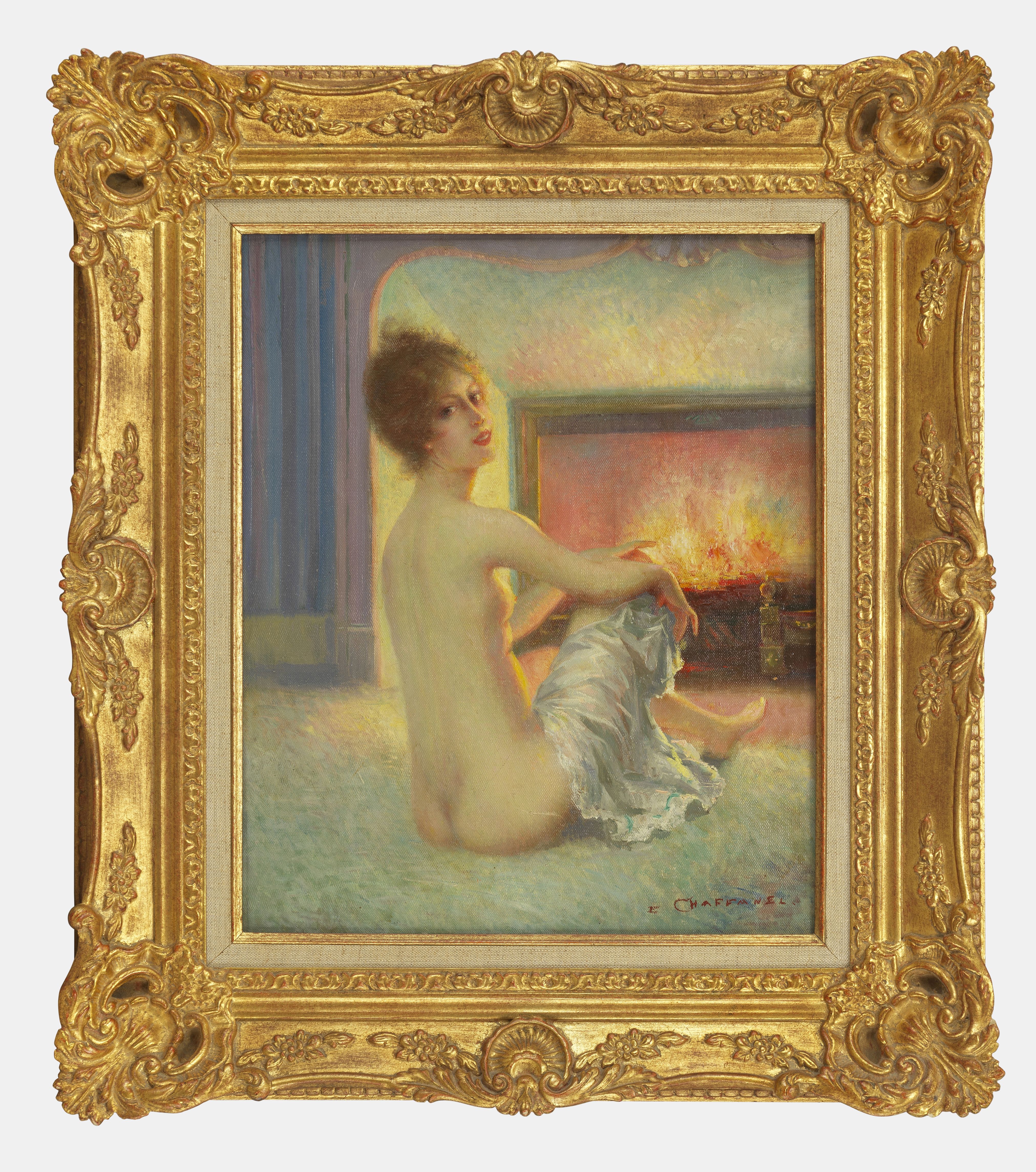 Nu au coin du feu, huile sur toile, signée, 46x38 cm