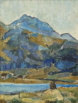 Lac de montagne, huile sur toile, signée et datée VIII 20, 35x27...