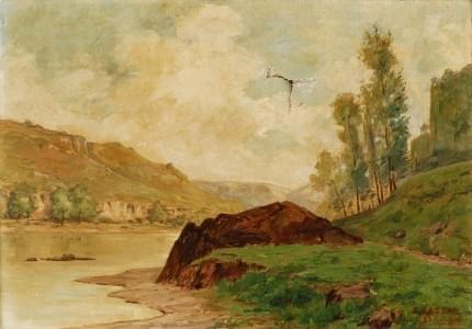 Paysage aux rochers, huile sur toile signée, datée 05, et notée...