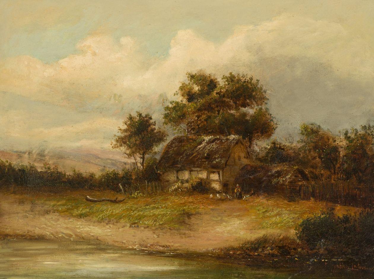 Paysage lacustre, huile sur toile, signée de son pseudonyme L. D...