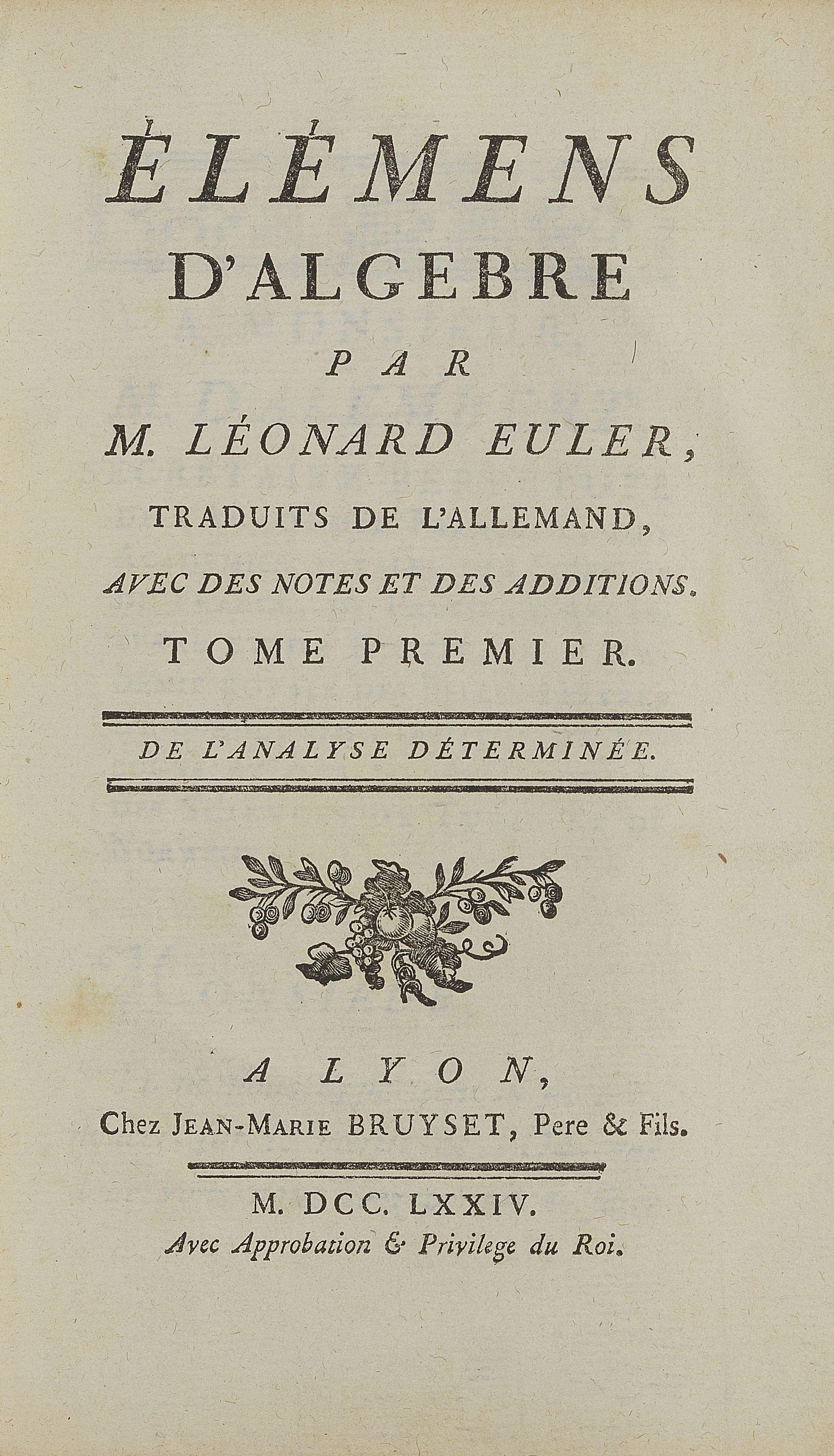29. EULER (Léonard) : Elémens d'algèbre. Lyon, Jean-Marie Bruyset, 1774
