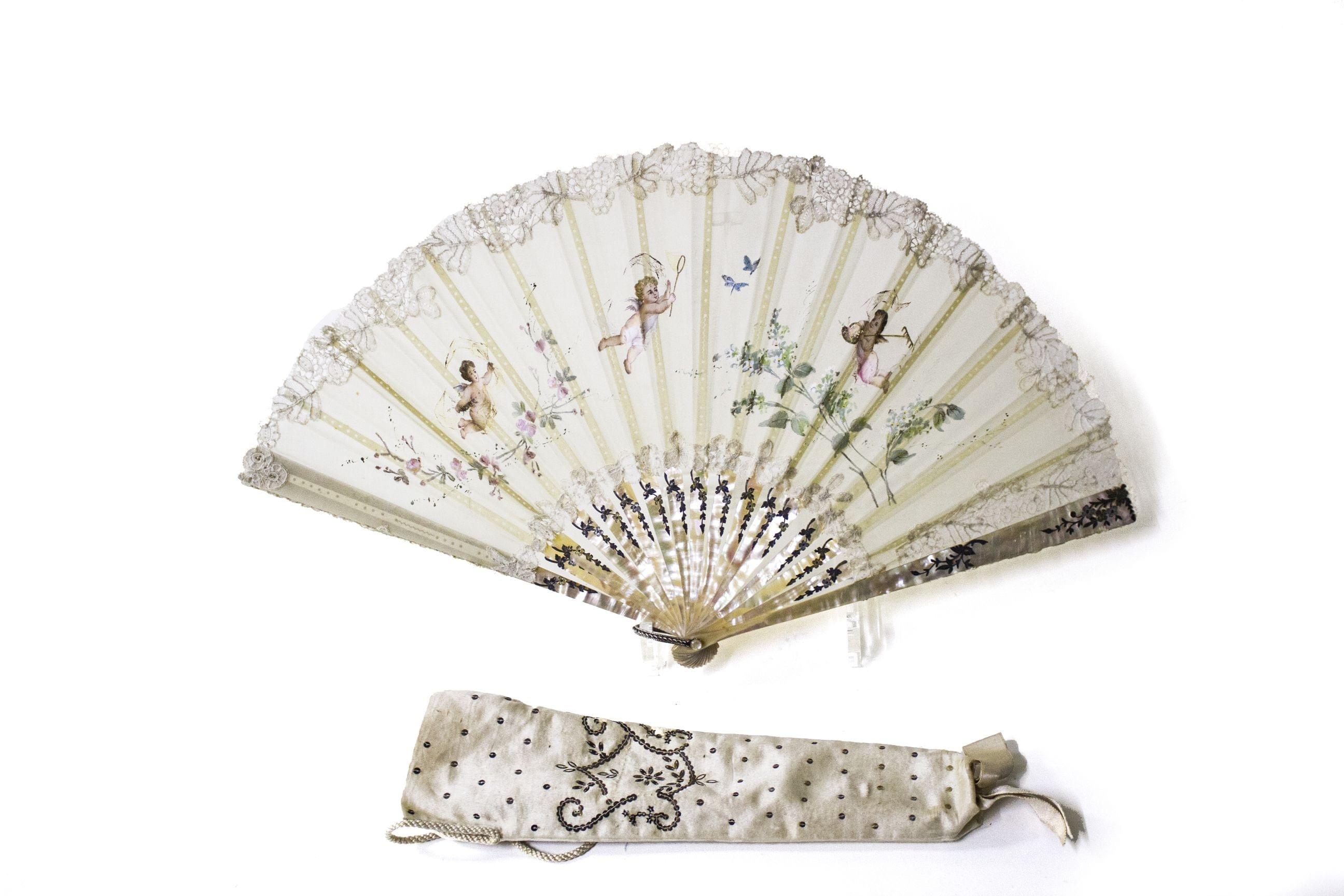 A décor de Putti et fleurs, nacre incrustée et dentelle, L 24 cm