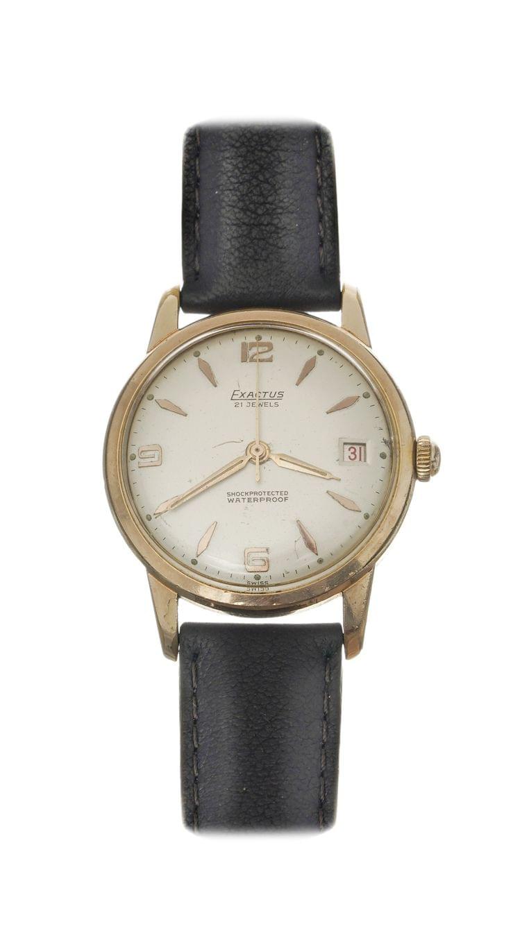 Cadran gris, aiguilles, index bâtons et chiffres arabes dorés, date à guichet à 3h, acier et plaqué or, D 34 mm
