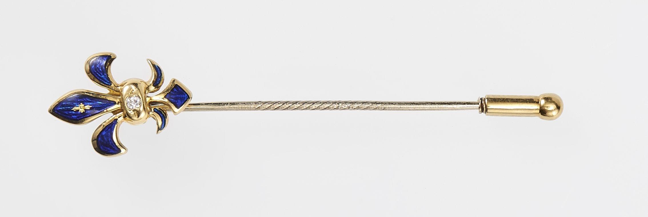 3166. Fabergé, épingle à motif de fleur de lys émaillée bleu roi sertie d'un diamant