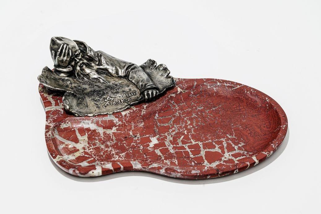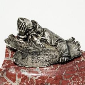 197. Fabergé, plateau de forme arrondie en marbre rouge orné d'une figure d'homme barbu tenant un parchemin enluminé et portant l'inscription Думный дьяк en argent