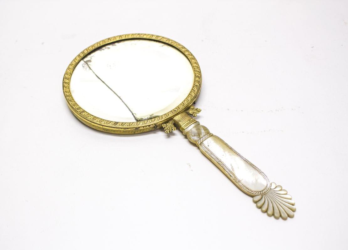 Bronze doré, nacre, sculpté de palmettes, glace au mercure, H 27 cm