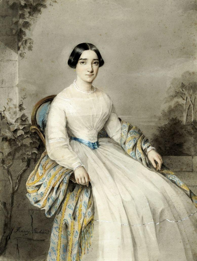 Portrait de Madame Jeanne Marion épouse Rivoire, aquarelle et pastel sur papier, signés, 39x29 cm. Provenance: Château fribourgeois