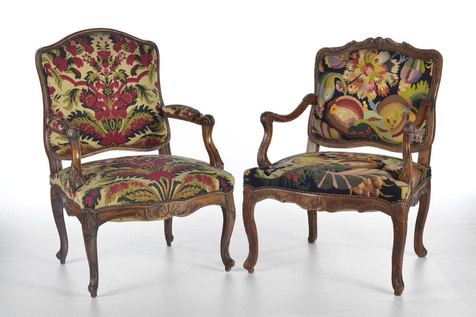 Hêtre sculpté, tapisserie au petit point à décor de fruits