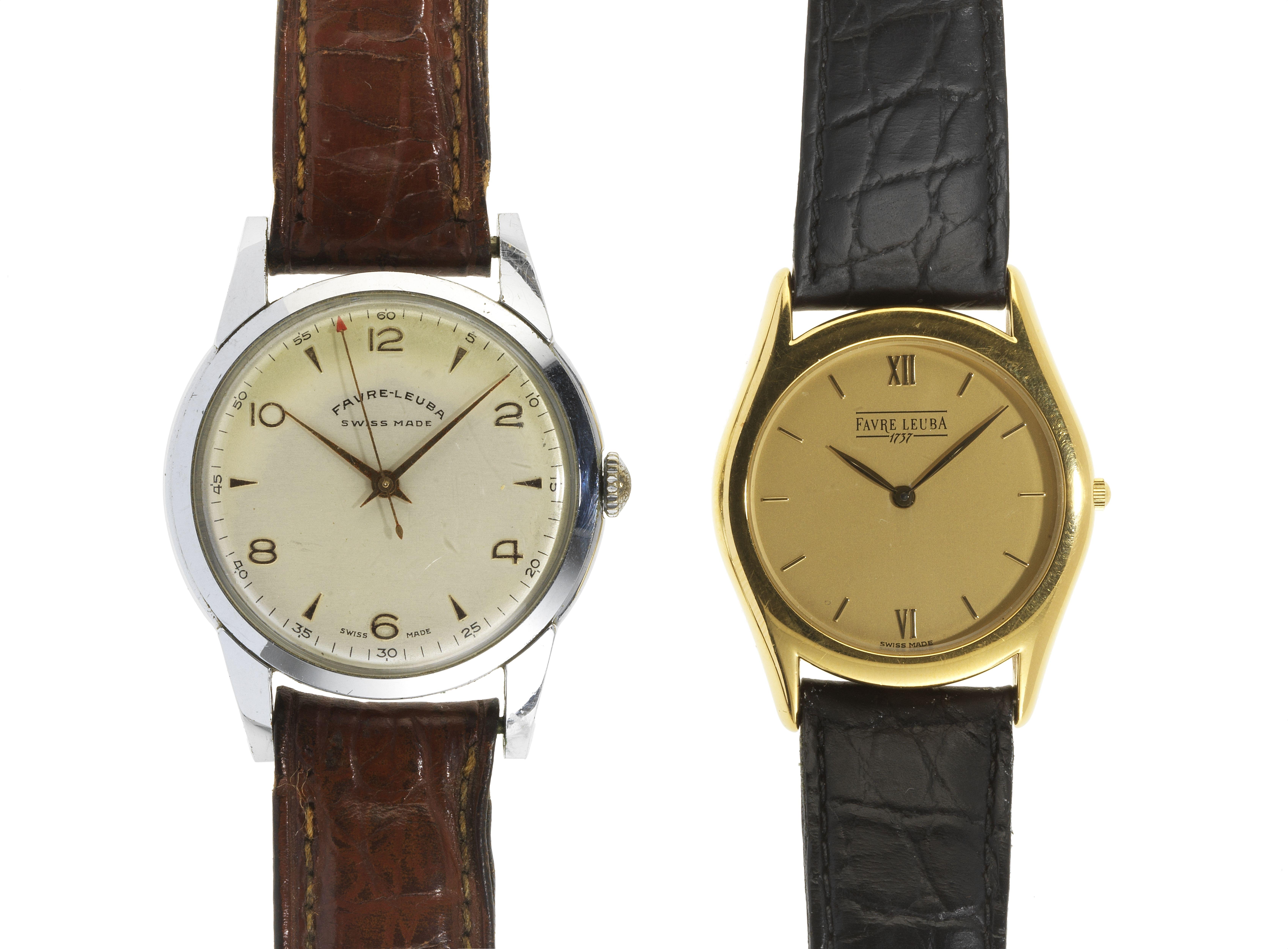La première à quarz, cadran doré et chiffres romains dorés, plaquée or, D 32 mm, la seconde, mécanique (mécanisme bloqué), cadran argenté, aiguilles et chiffres arabes dorés, acier, D 36 mm