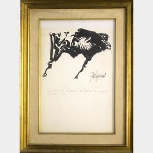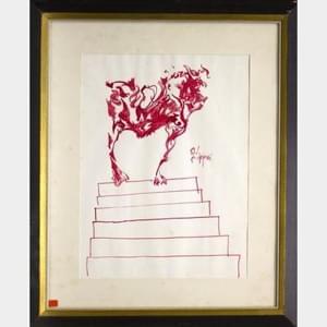 Taureau en haut de l'escalier, marqueur rouge sur papier, signé,...