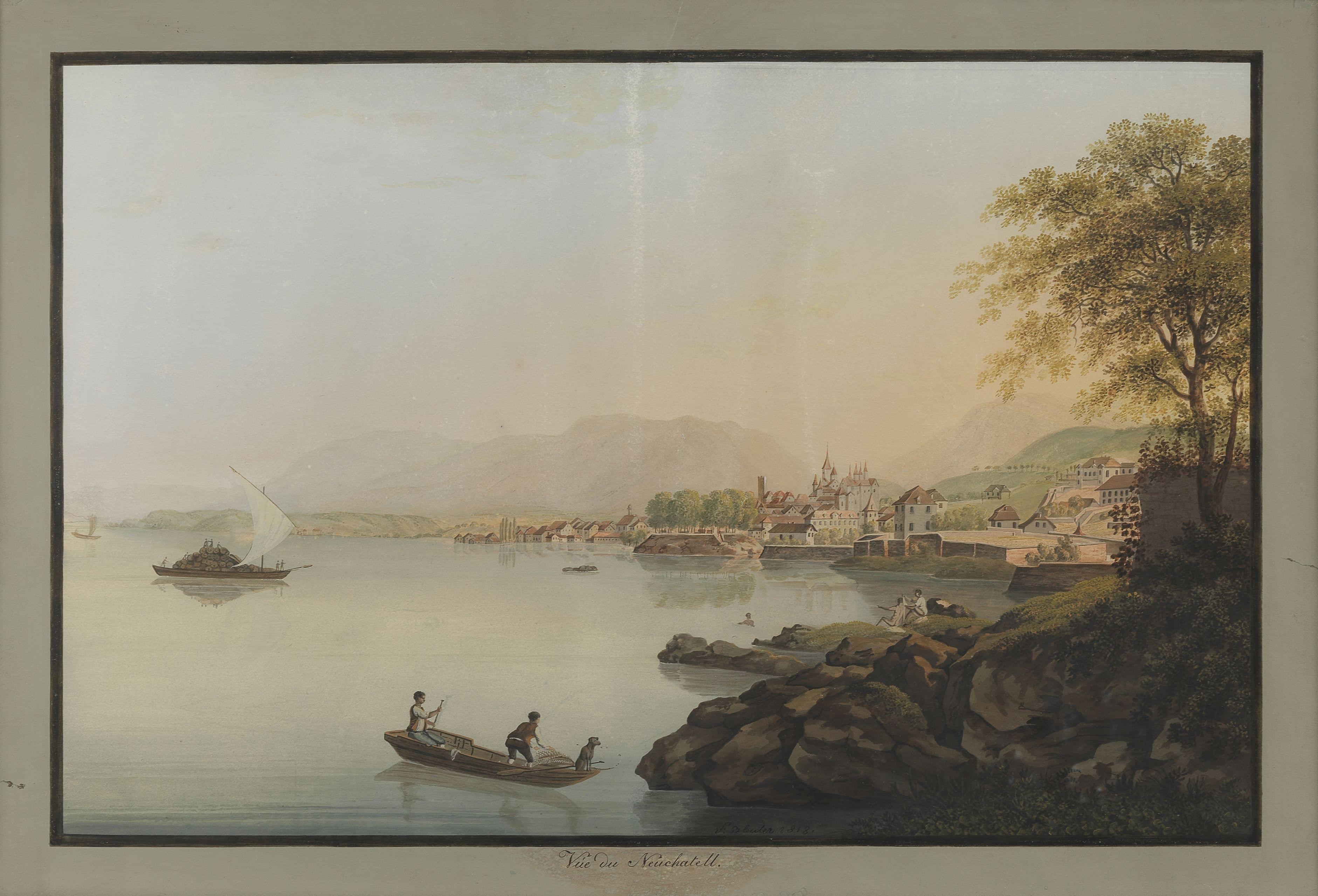 Vue de Neuchâtel de l'Est, gravure gouachée et aquarellée, datée 1818, 41x63 cm