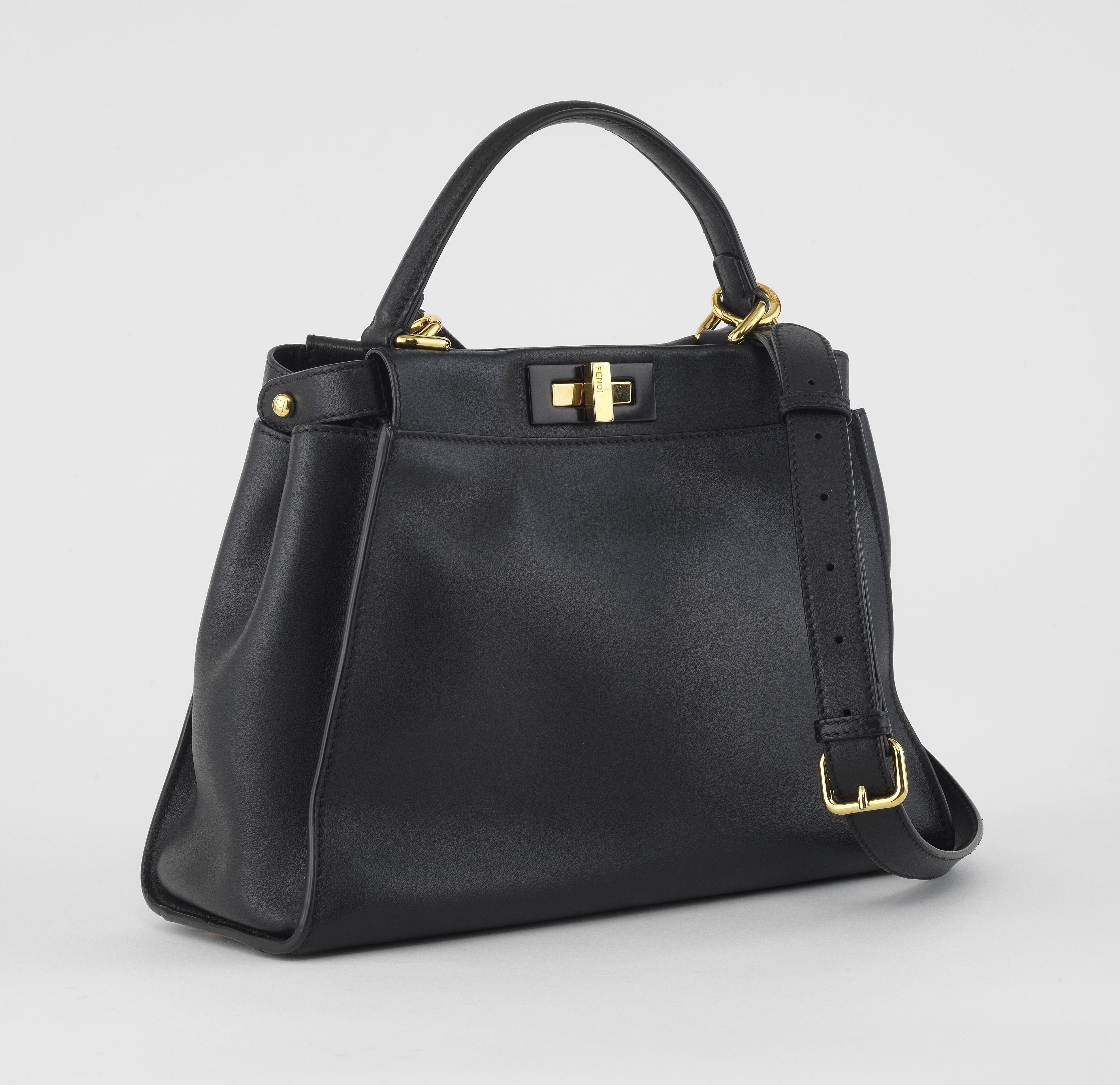 Cuir de veau noir et surpiqûres, garniture en métal doré, fermoir pivotant, intérieur à deux soufflets avec une poche latérale zippée, anse, bandoulière amovible, env. 25x34x13 cm