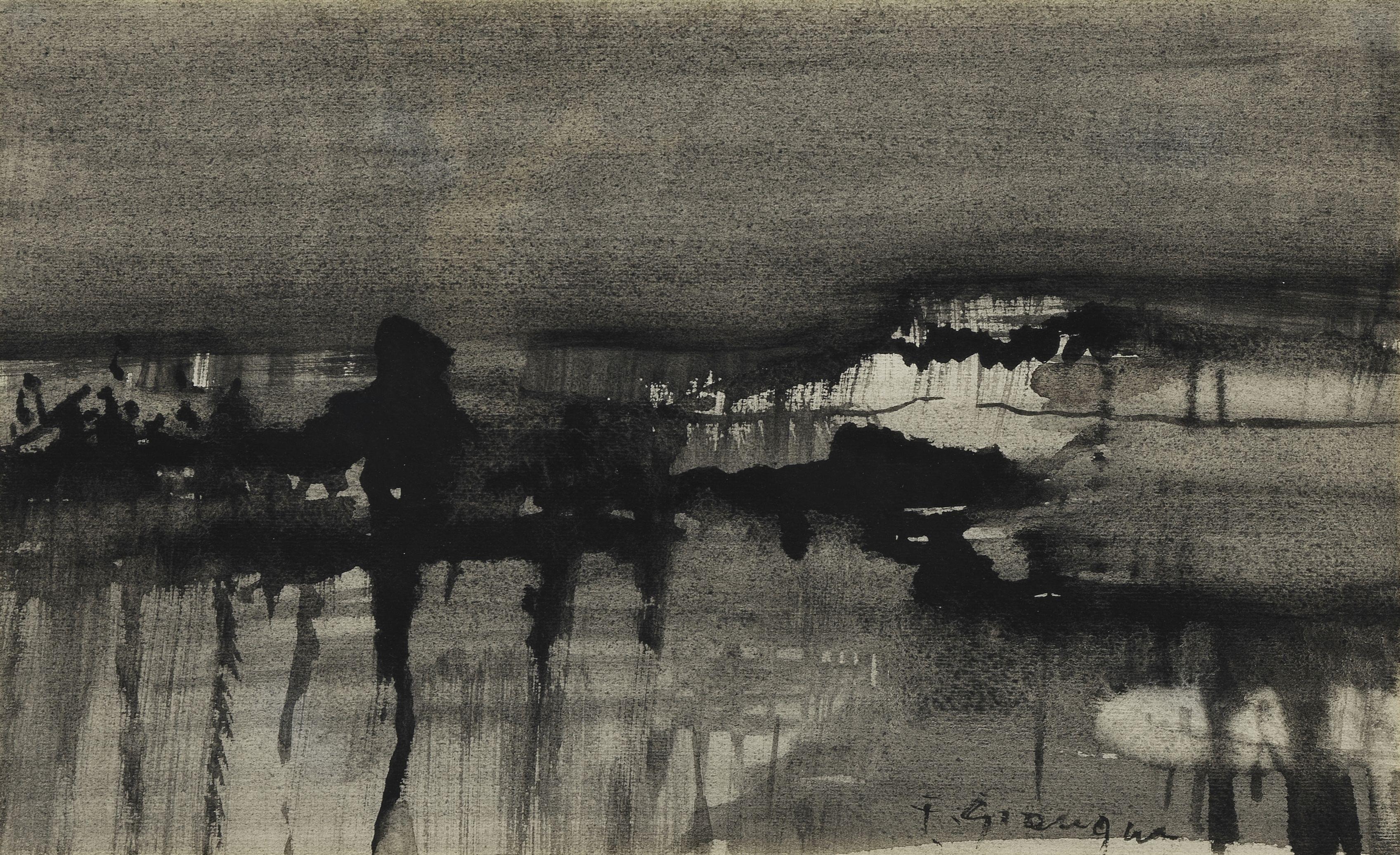 Paysage, encre de Chine et lavis sur papier, signé, 21x34 cm
