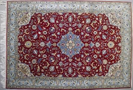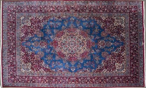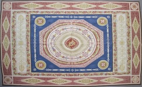 Motif central sur fond bleu, bordure sur fond rouge, fine bande...