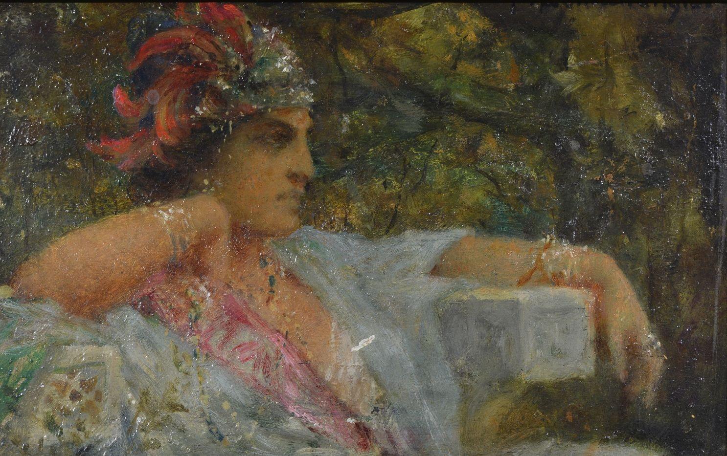Femme au turban, huile sur panneau non signée, porte une mention au dos "Prix de Rome Médaille d'or du salon, né en 1850", 12x18 cm