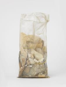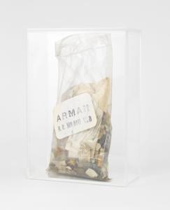 Poubelle de poche ou Poubelle de Milan, 1970, réalisée et distribuée à l’occasion du 10ème anniversaire du Festival du « Nouveau Réalisme » à Milan le 27 novembre 1970 pour la création du Nouveau Réalisme, accumulation de déchets de métro (billet, cigarettes, papiers, etc…) dans un sachet plastique scellé, impression à l’encre noire sur une étiquette à l’extérieur du sachet : ARMAN N.R. MILANO 1970, non signée, 28x14x4 cm