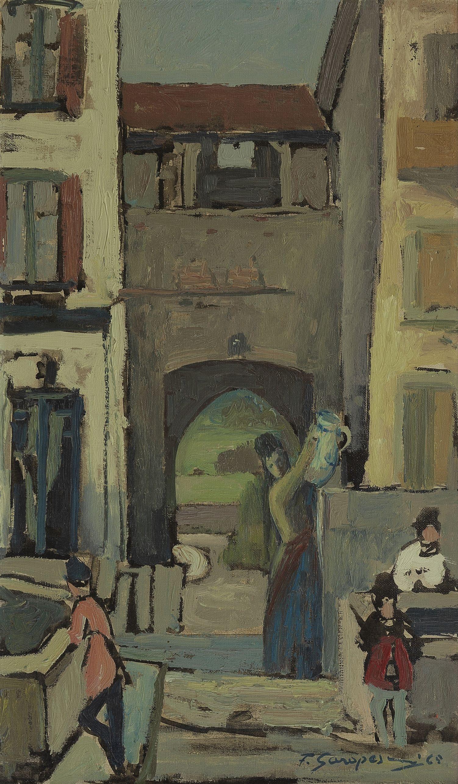 Scène de rue à Gruyères, acrylique sur toile, signée et datée 1965, 50,5x29,5 cm