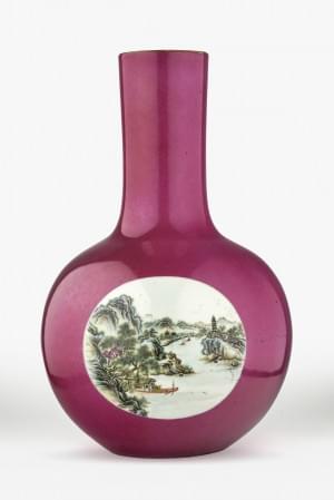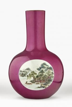 Porcelaine émaillée polychrome à décor de trois médaillons représentant des paysages, H 42 cm