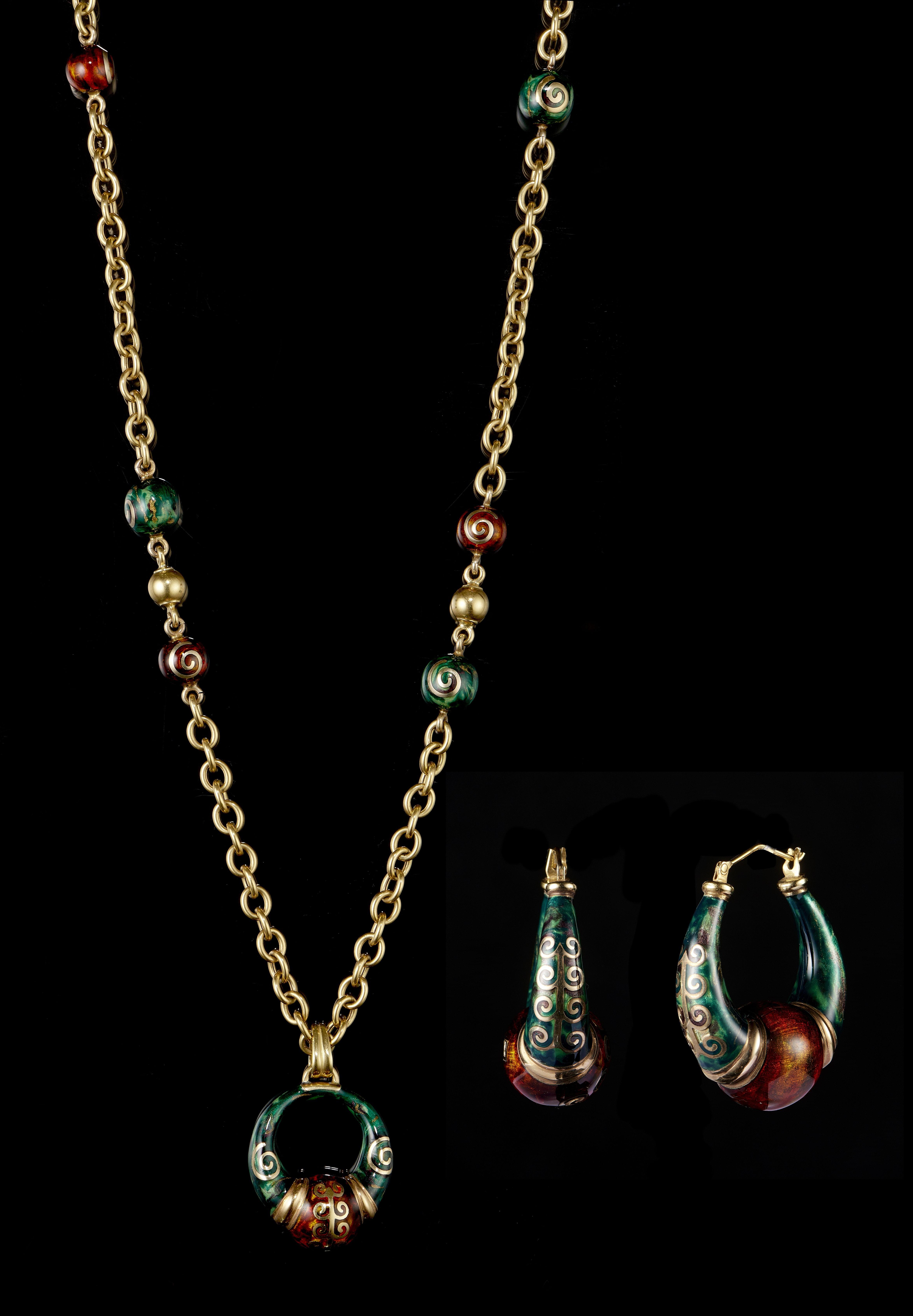 148. Fidia Firenze, ensemble d'un collier à maille ronde ponctué de perles émaillées et retenant un pendentif émaillé vert et ocre rehaussés de motifs de spirales en or, et de boucles d'oreilles émaillées au même motif