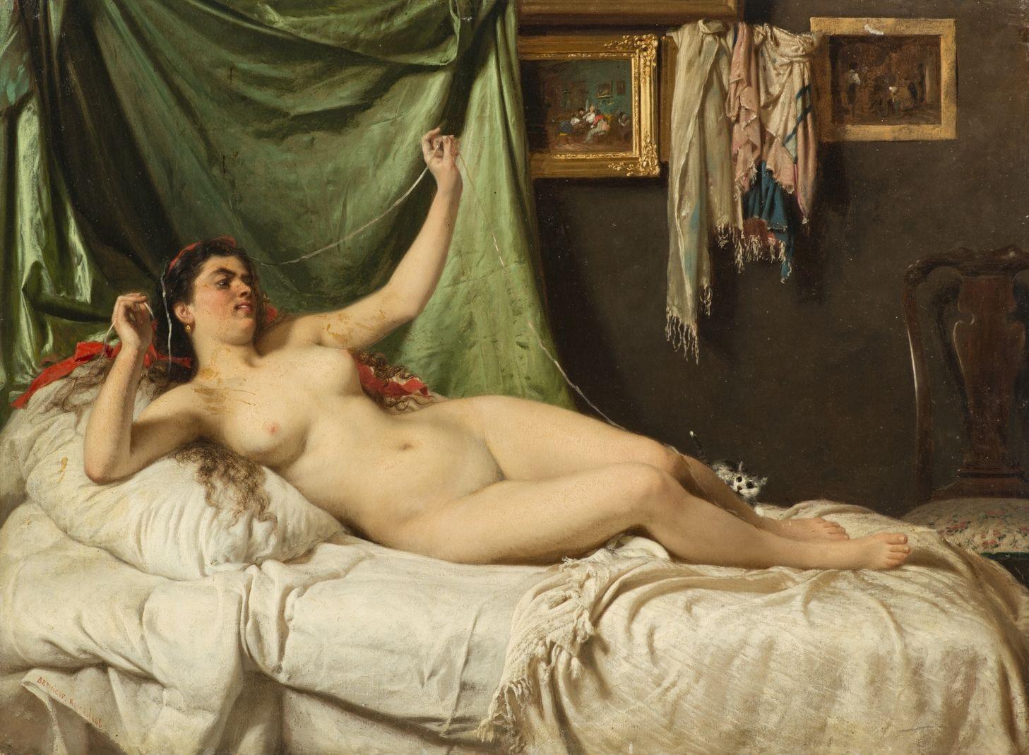 Jeune femme allongée nue, huile sur papier marouflée sur carton, signée, située Roma et datée 1868, 42x57 cm