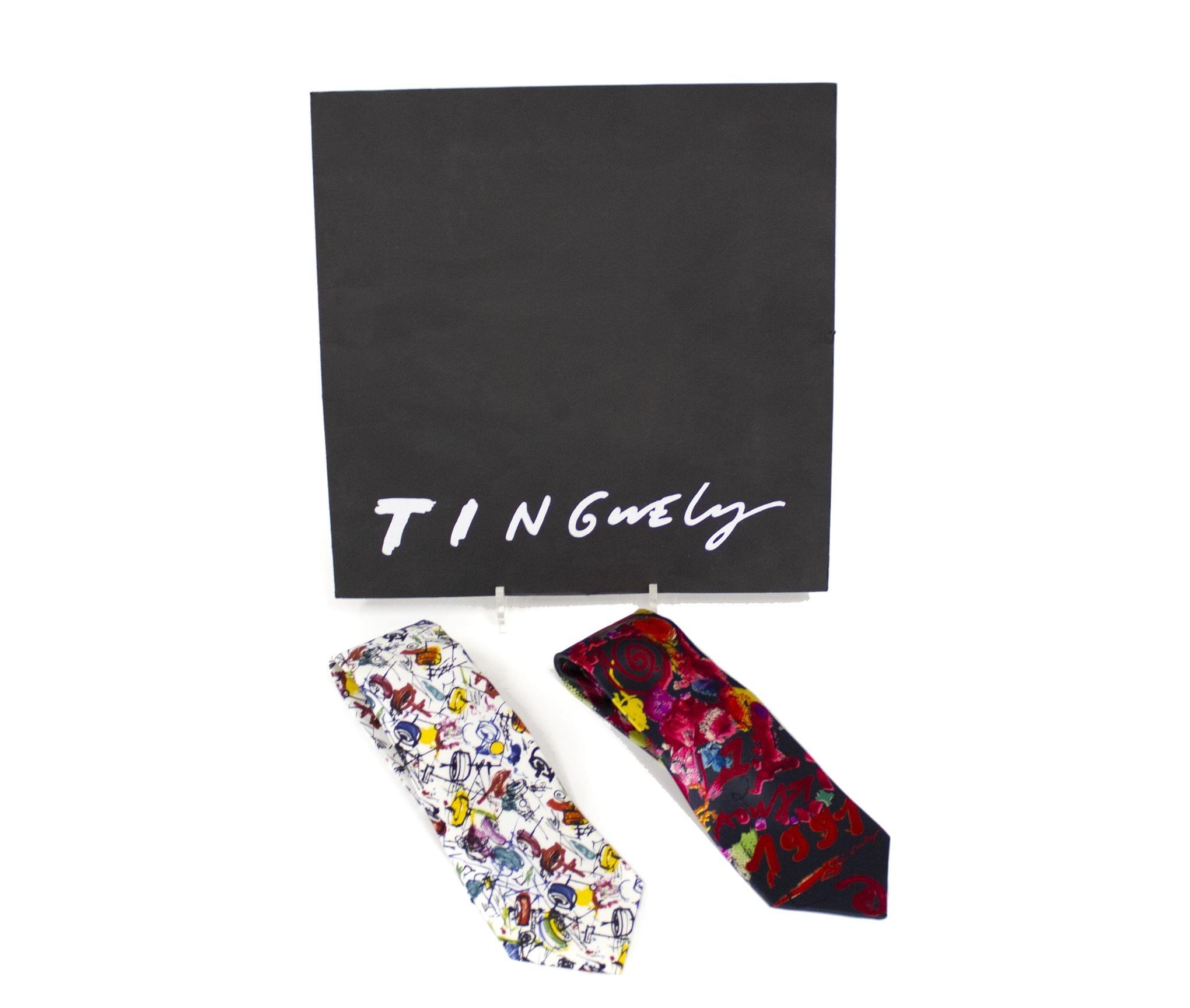 Soie imprimée de Lyon, n°236/1000, 100x100 cm. On joint une cravate en soie à fond noir et motifs colorés dessinée par Tinguely pour l'Etat de Vaud, L 136 cm, ainsi qu'une cravate Missioni en soie à fond blanc et motifs colorés, L 140 cm.