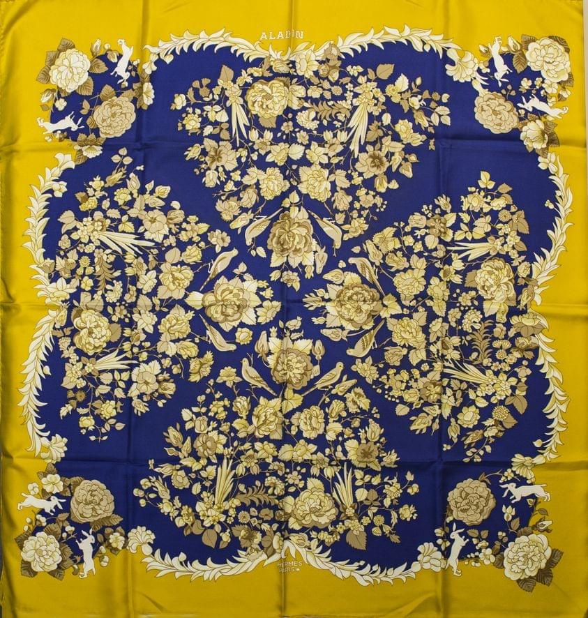 A décor de fleurs et petits animaux jaunes sur fond bleu, soie, 89x89 cm
