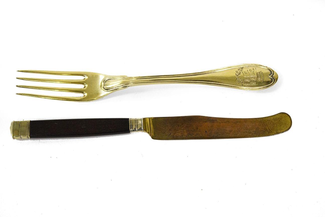 3406. Fourchette et couteau d'époque Empire gravés d'armoiries d'alliances et scènes de chasse,