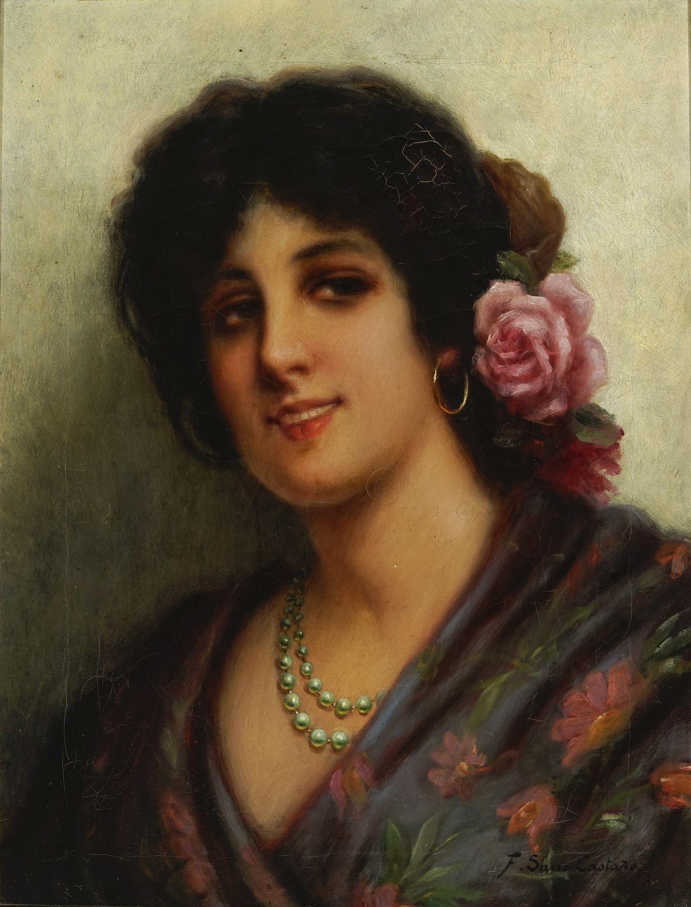Portrait de jeune femme andalouse, huile sur toile, signée, 46,5x35,5 cm