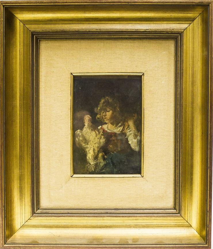 Jeune fille à la poule, huile sur papier marouflé sur carton, signée 19x13 cm