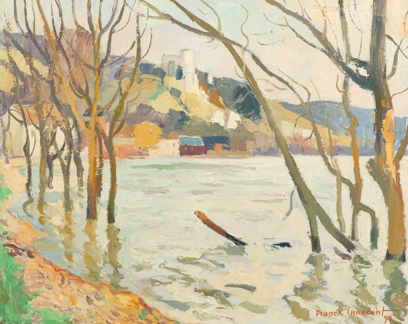 Inondations aux Andelys, huile sur toile, signée, datée 70 et titrée au dos, 63 x 79 cm