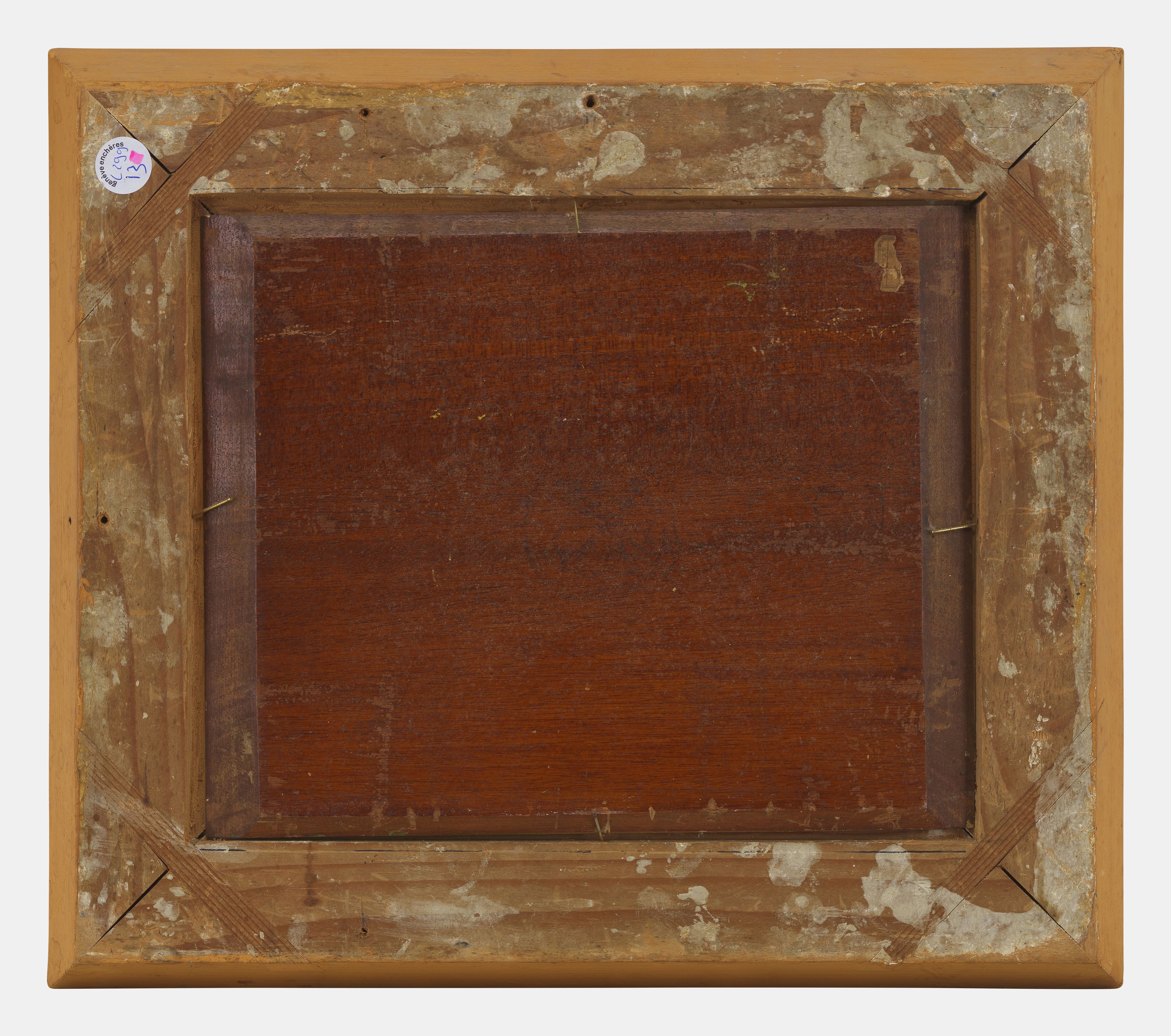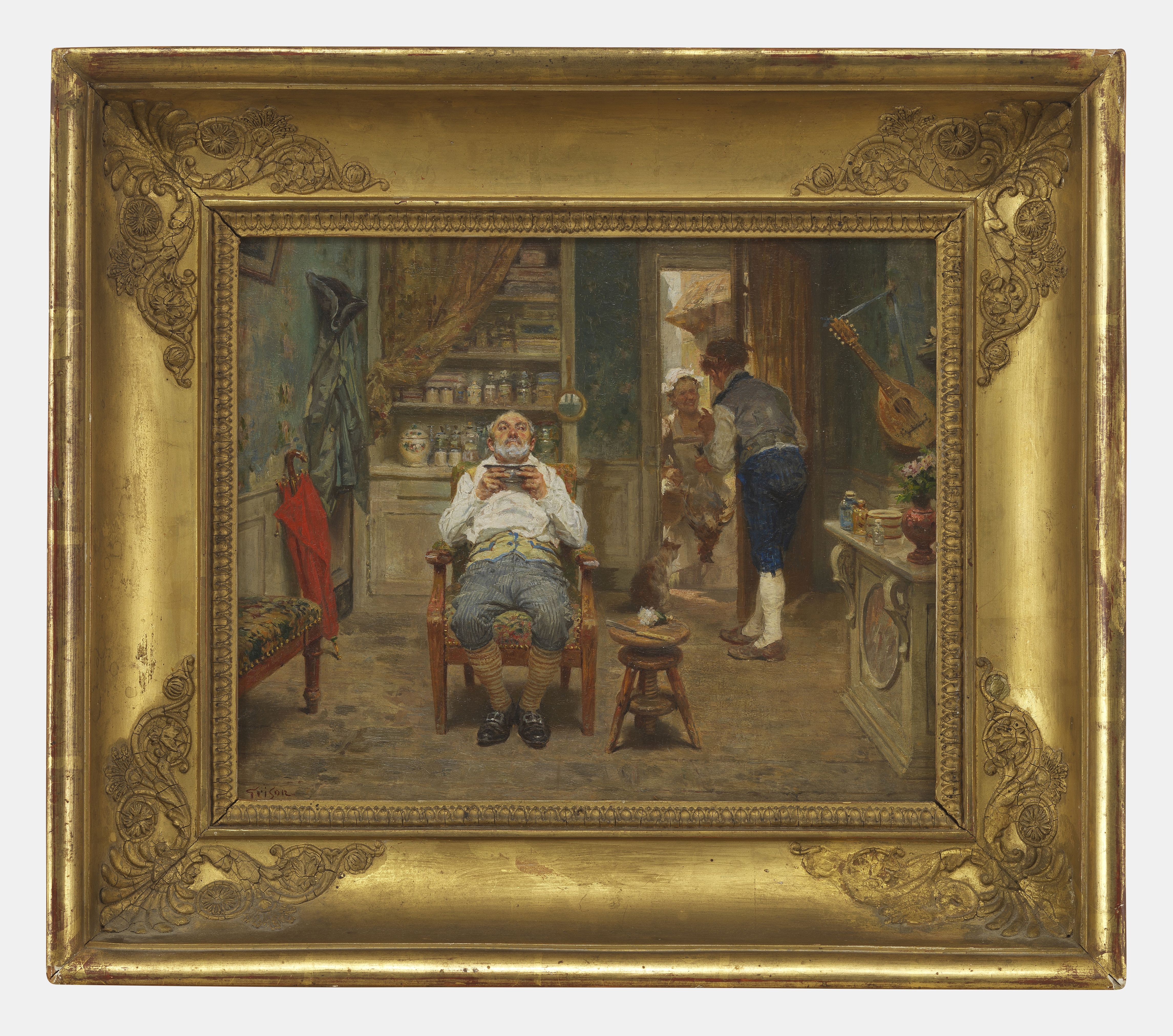 Interruption chez le barbier, huile sur panneau, signée, 22x26 cm