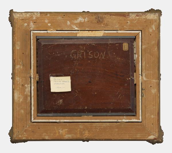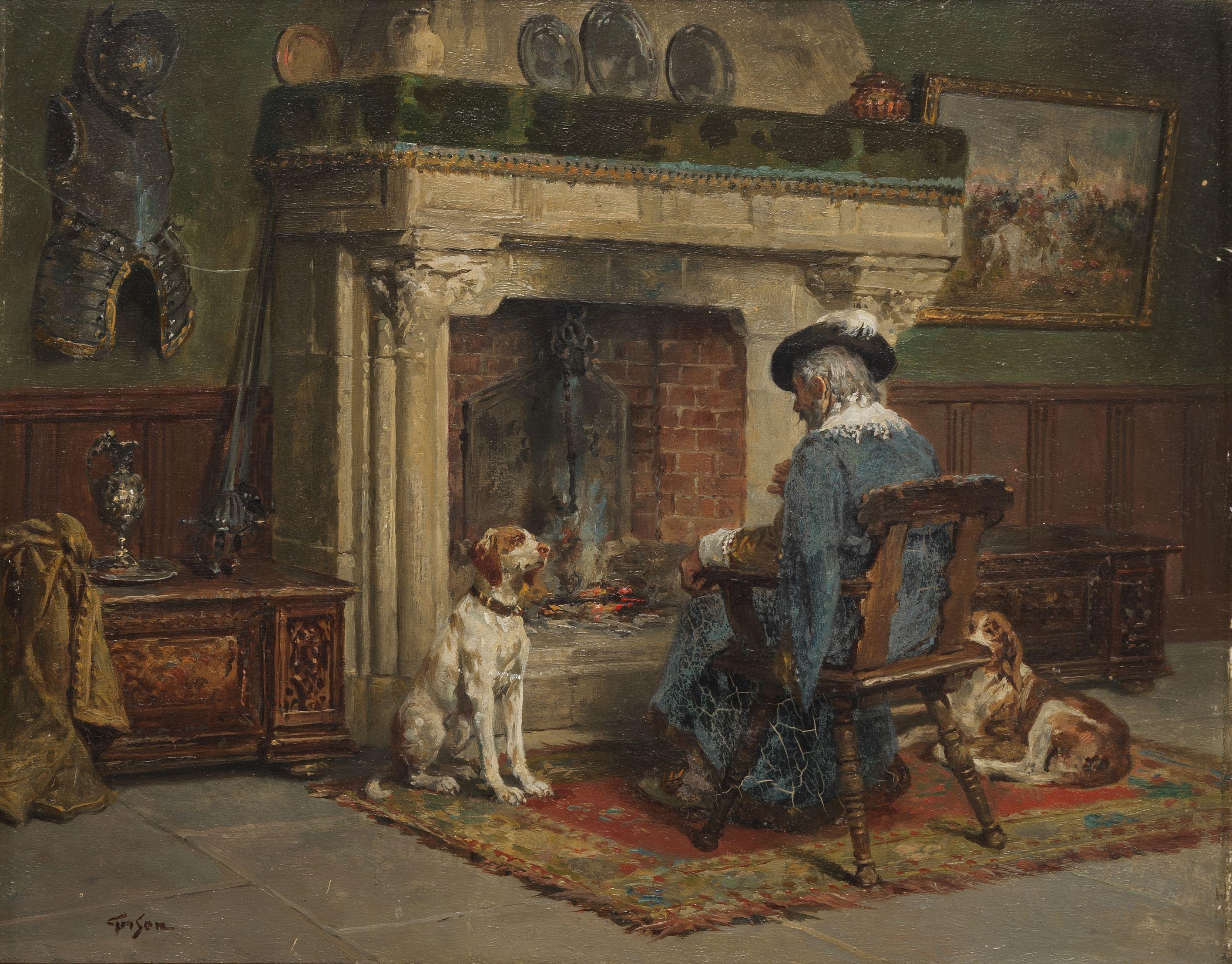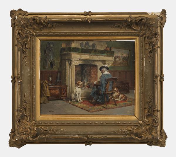 Gentilhomme avec ses chiens devant une cheminée, huile sur panneau, signée, 19x25 cm