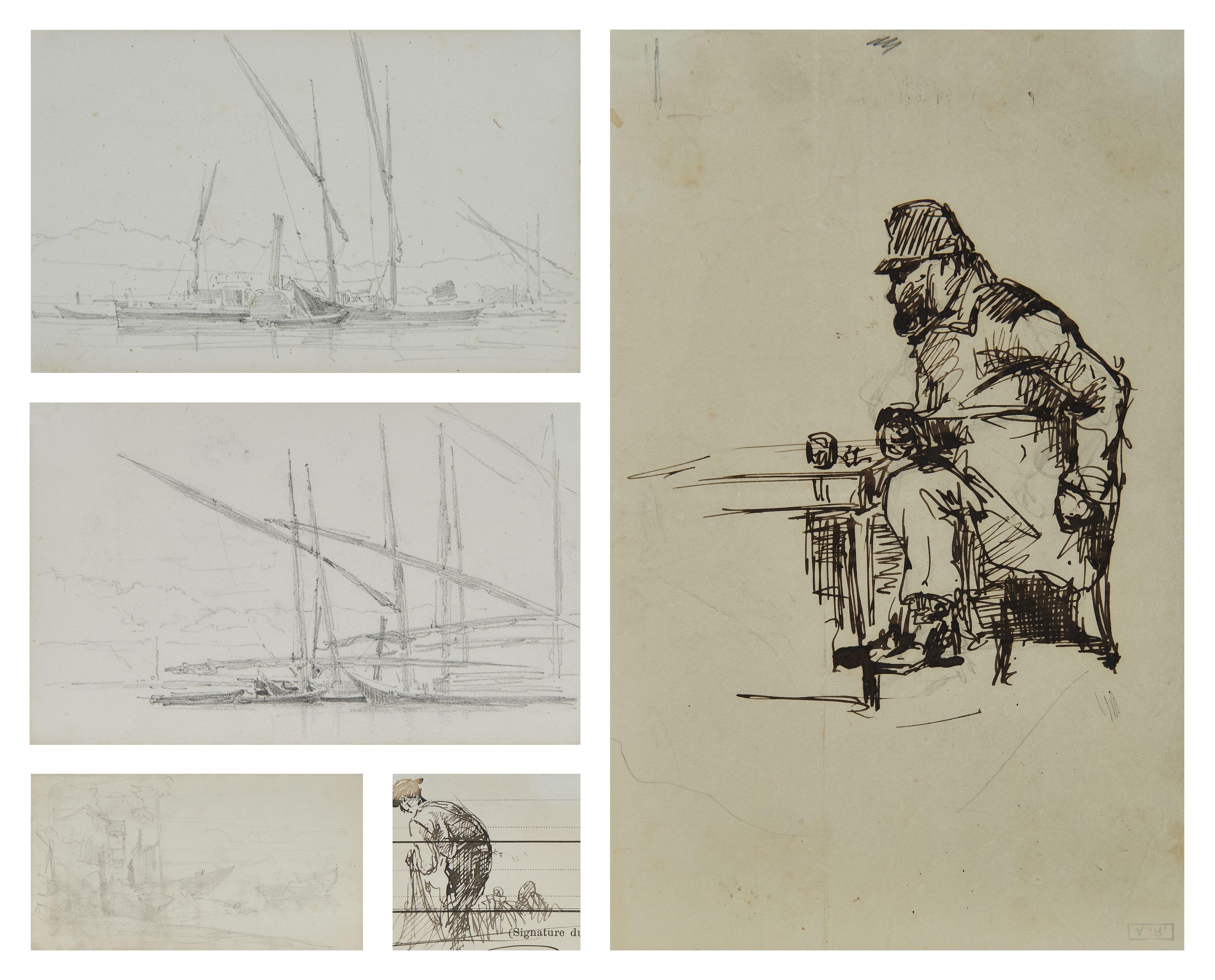 Ensemble de cinq dessins: l'homme attablé, barques et vapeur au bord du Léman, bord du lac à Tourronde…, de 5x5 à 23,5x16 cm