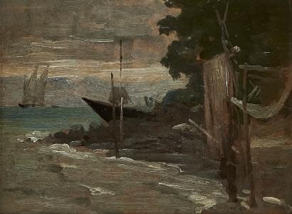 Berge et bateaux, huile sur carton, signée, 17,5x22,5 cm