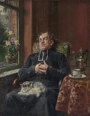 La sieste de Monsieur le curé et son chat, huile sur panneau, si...