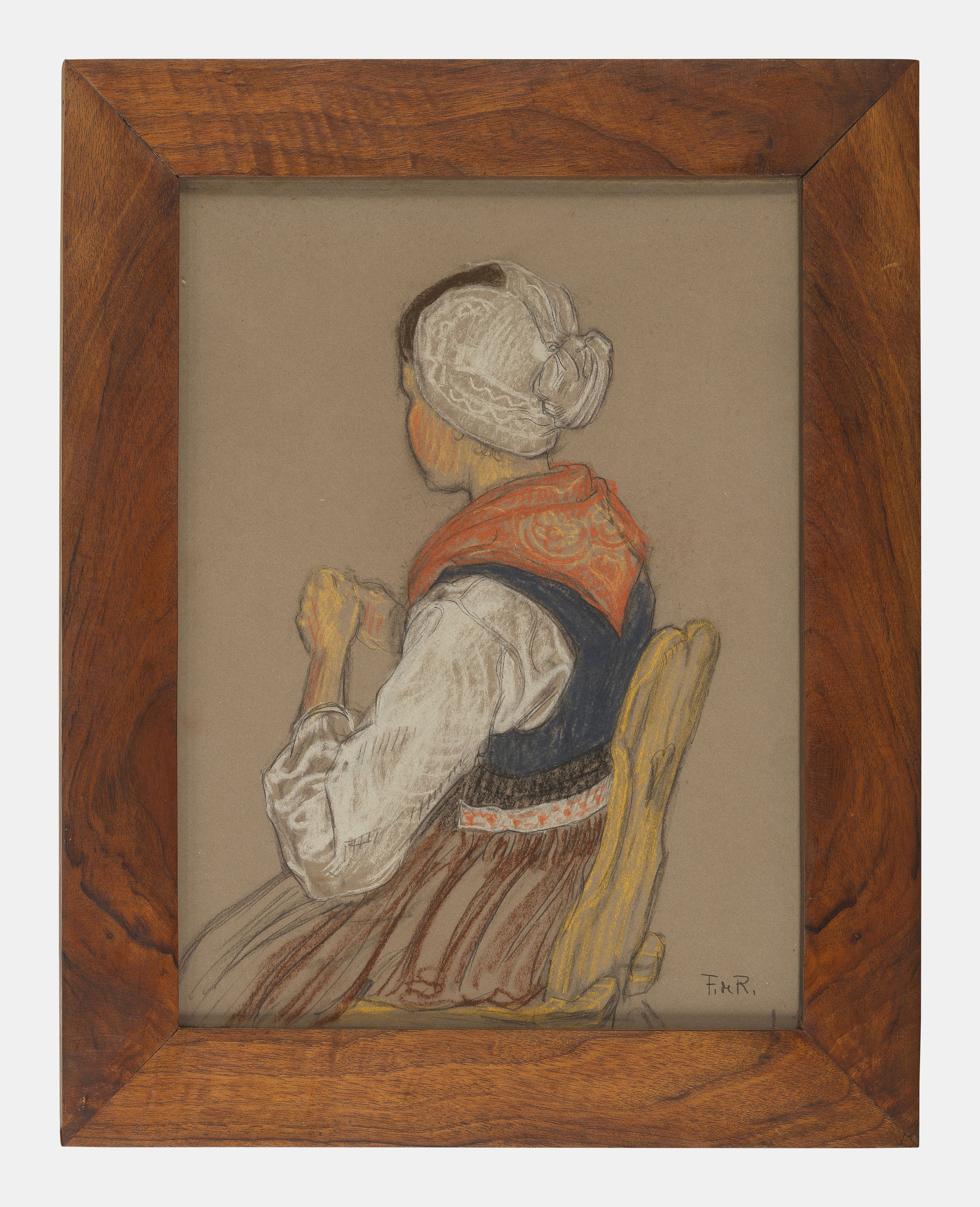 Valaisanne assise de dos, pastel sur papier, signé, 32x24 cm