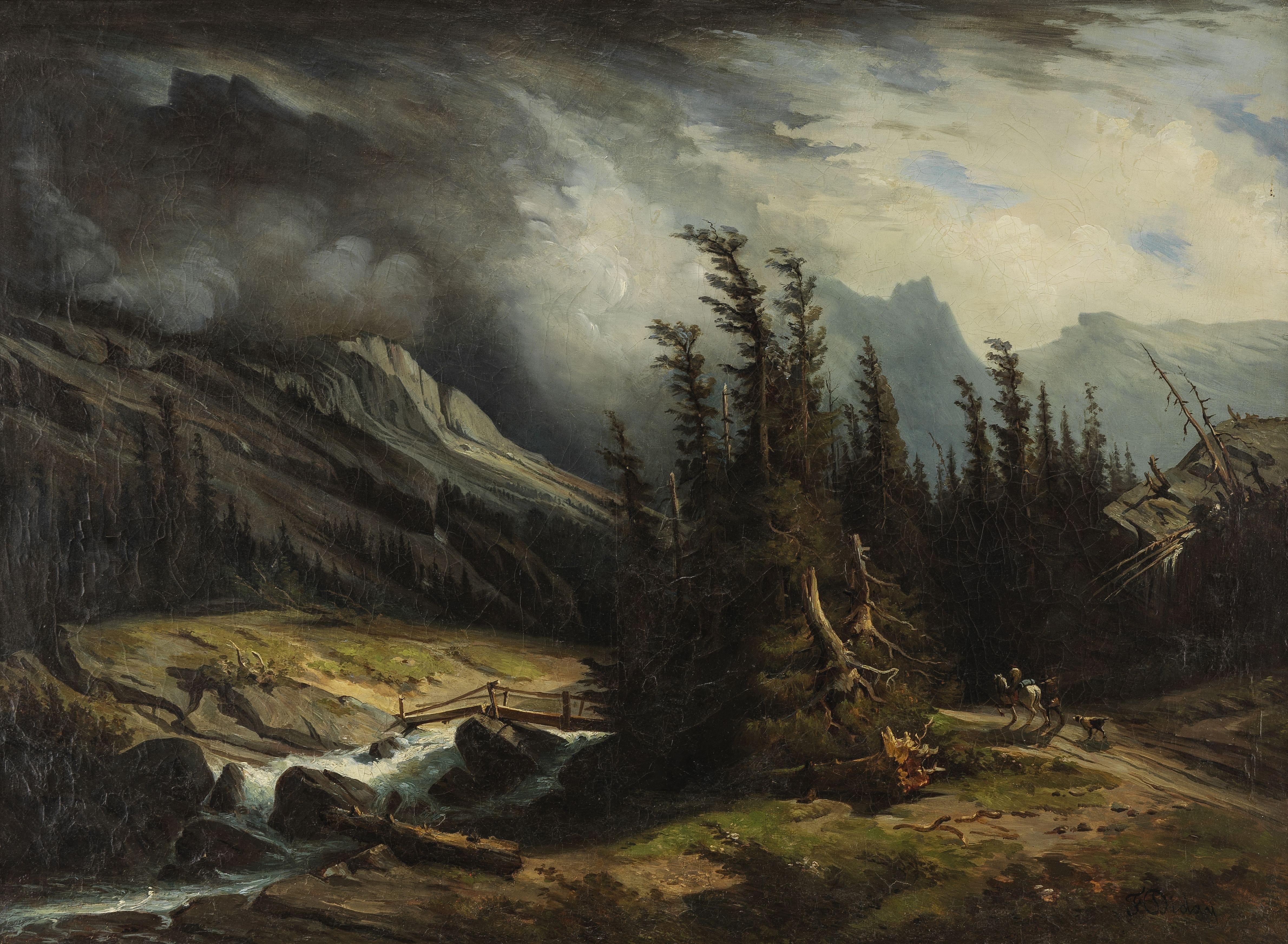 Orage à la Handeck, huile sur toile, signée, 68x93 cm. Bibliographie pour comparaison: "François Diday, Chemin du col du Grimsel à la Handeck, 1855", au Musée d'art du Valais, Sion - Collectionner au cœur des Alpes, dir. Pascal Ruedin, Sion, Musées cantonaux, Paris, Somogy, 2007, pp. 42-43, cat n° 6.