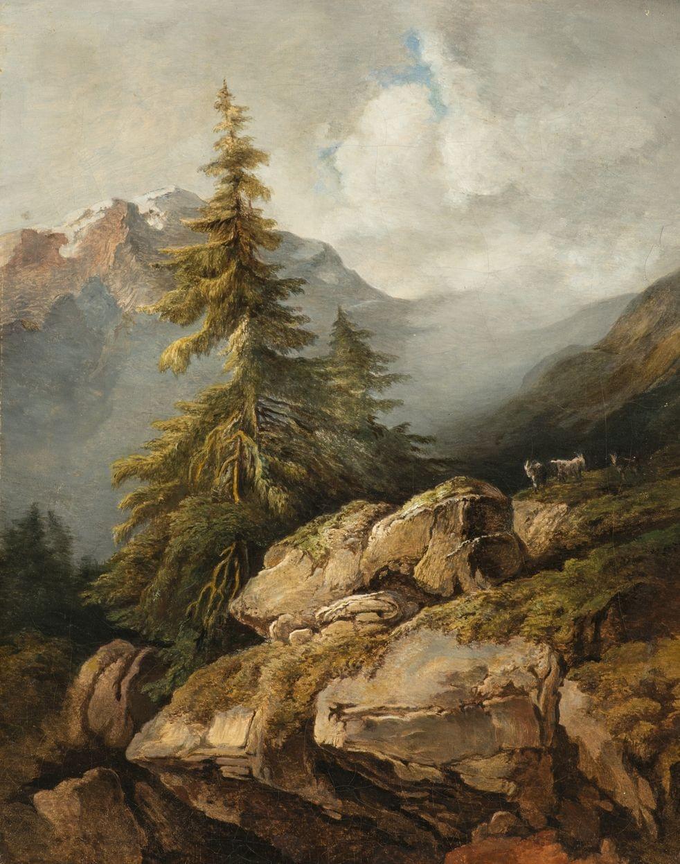 Paysage des Alpes, sapins, rochers, chèvres, huile sur toile, 42x33 cm, annotation au dos "exécutée et donnée par l'artiste à son ami Jules Jequier"
